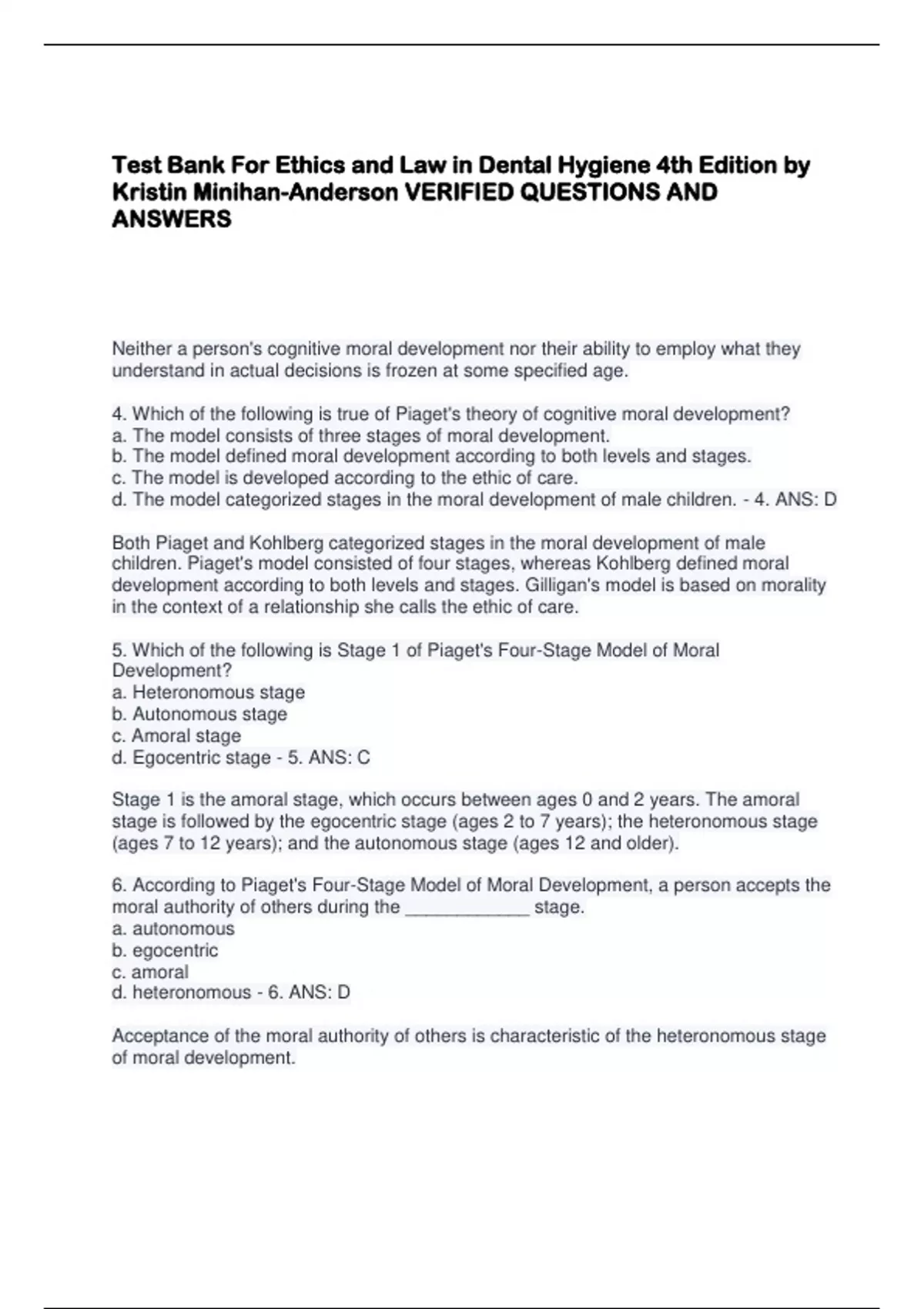 Test Bank For Ethics and Law in Dental Hygiene 4th Edition by Kristin Minihan-Anderson VERIFIED QUESTIONS AND ANSWERS