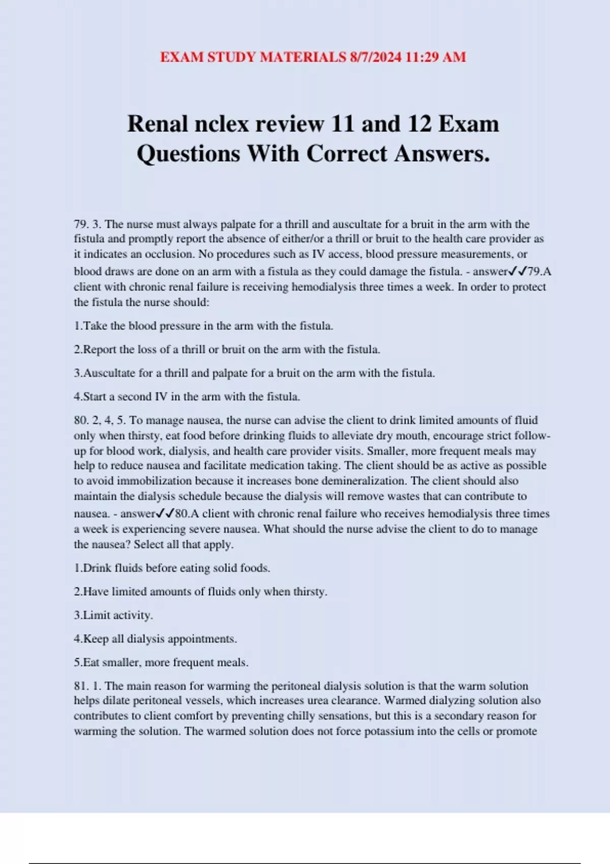 nausea. - answer✔✔80.A client with chronic renal failure who receives hemodialysis three times