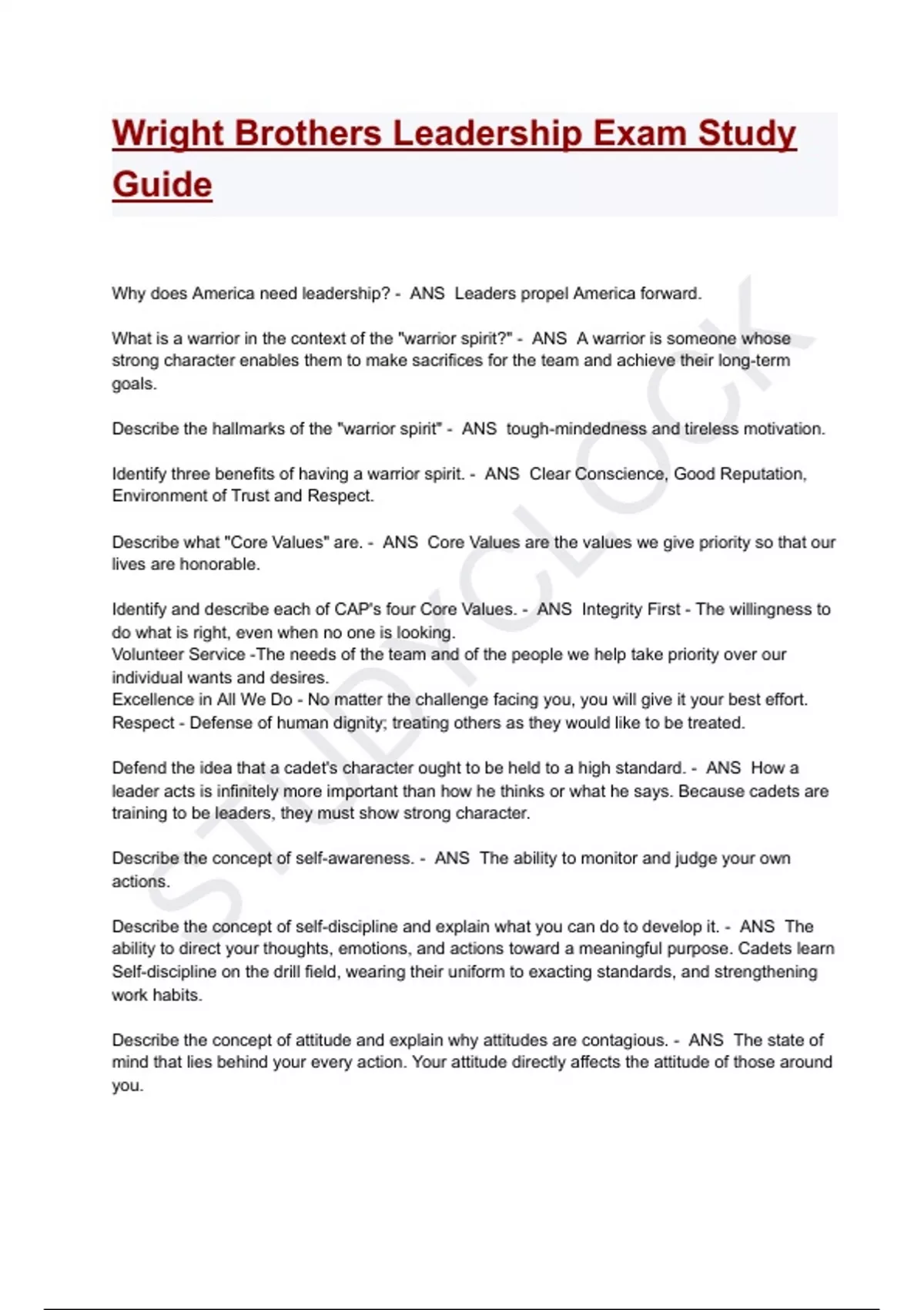 Wright Brothers Leadership Exam Study Guide Questions With Correct Solutions Why does America need leadership? - ANS Leaders propel America forward. What is a warrior in the context of the "warrior spirit?" - ANS A warrior is someone whose strong character enables them to make sacrifices for the team and achieve their long-term goals. Describe the hallmarks of the "warrior spirit" - ANS tough-mindedness and tireless motivation. Identify three benefits of having a warrior spirit. - ANS Clear Conscience, Good Reputation, Environment of Trust and Respect. Describe what "Core Values" are. - ANS Core Values are the values we give priority so that our lives are honorable. Identify and describe each of CAP's four Core Values. - ANS Integrity First - The willingness to do what is right, even when no one is looking. Volunteer Service -The needs of the team and of the people we help take priority over our individual wants and desires. Excellence in All We Do - No matter the challenge facing you, you will give it your best effort. Respect - Defense of human dignity; treating others as they would like to be treated. Defend the idea that a cadet's character ought to be held to a high standard. - ANS How a leader acts is infinitely more important than how he thinks or what he says. Because cadets are training to be leaders, they must show strong character. Describe the concept of self-awareness. - ANS The ability to monitor and judge your own actions. Describe the concept of self-discipline and explain what you can do to develop it. - ANS The ability to direct your thoughts, emotions, and actions toward a meaningful purpose. Cadets learn Self-discipline on the drill field, wearing their uniform to exacting standards, and strengthening work habits. Describe the concept of attitude and explain why attitudes are contagious. - ANS The state of mind that lies behind your every action. Your attitude directly affects the attitude of those around you.