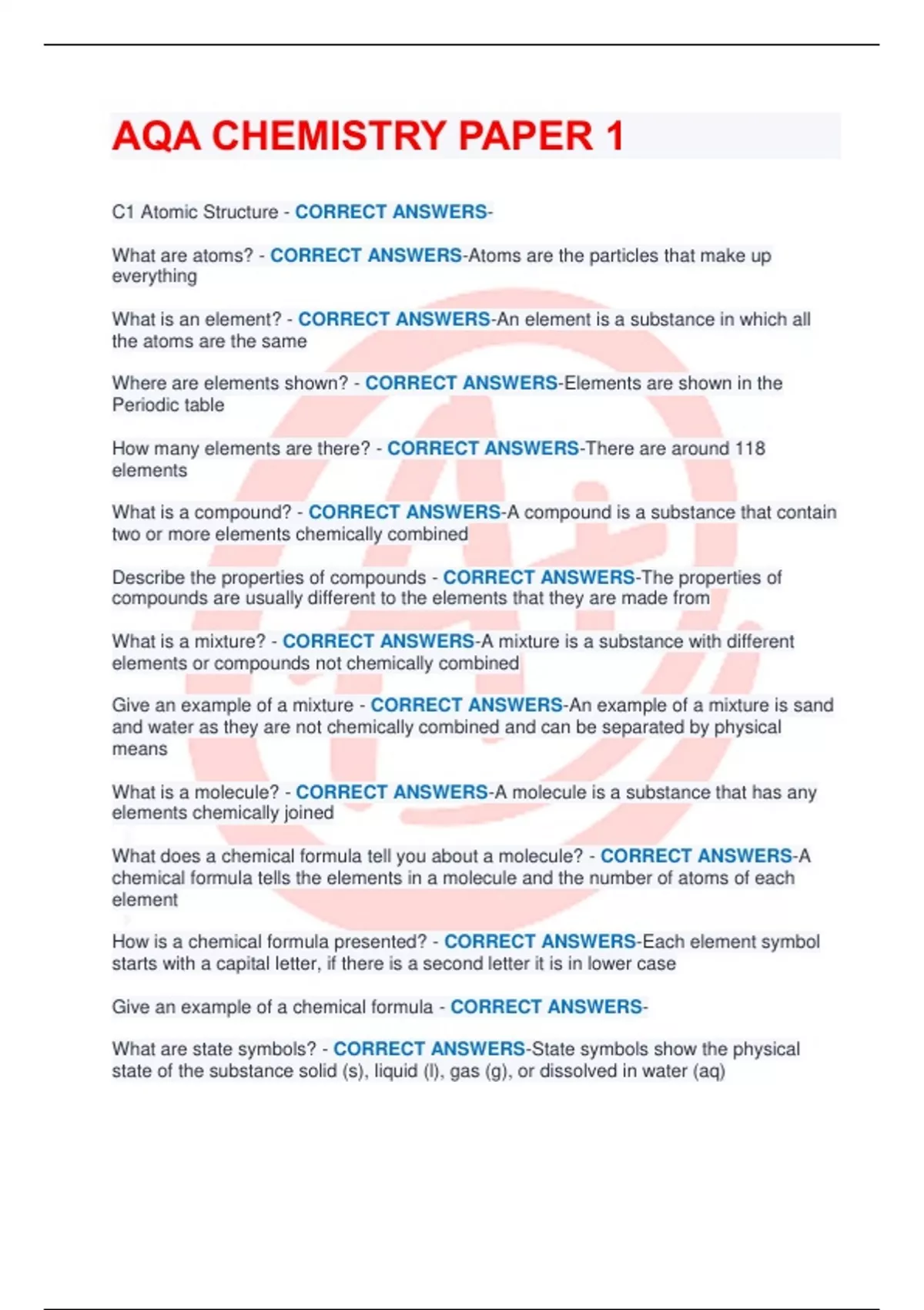 C1 Atomic Structure - CORRECT ANSWERS-