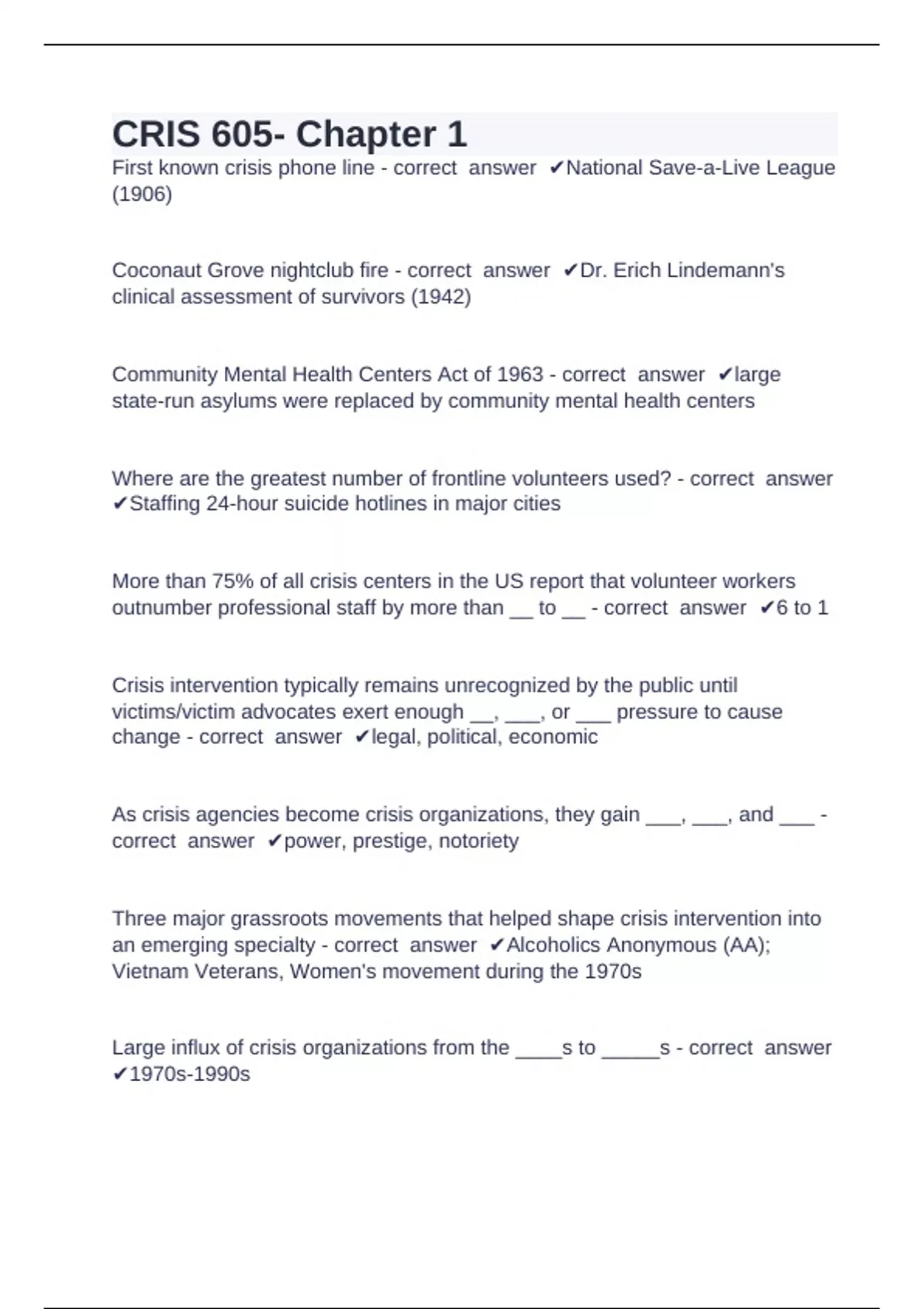 CRIS 605 Question and answers already passed First known crisis phone line - correct answer National Save-a-Live League (1906) Coconaut Grove nightclub fire - correct answer Dr. Erich Lindemann's clinical assessment of survivors (1942) Community Mental Health Centers Act of 1963 - correct answer large state-run asylums were replaced by community mental health centers Where are the greatest number of frontline volunteers used? - correct answer Staffing 24-hour suicide hotlines in major cities More than 75% of all crisis centers in the US report that volunteer workers outnumber professional staff by more than __ to __ - correct answer 6 to 1 Crisis intervention typically remains unrecognized by the public until victims/victim advocates exert enough __, ___, or ___ pressure to cause change - correct answer legal, political, economic