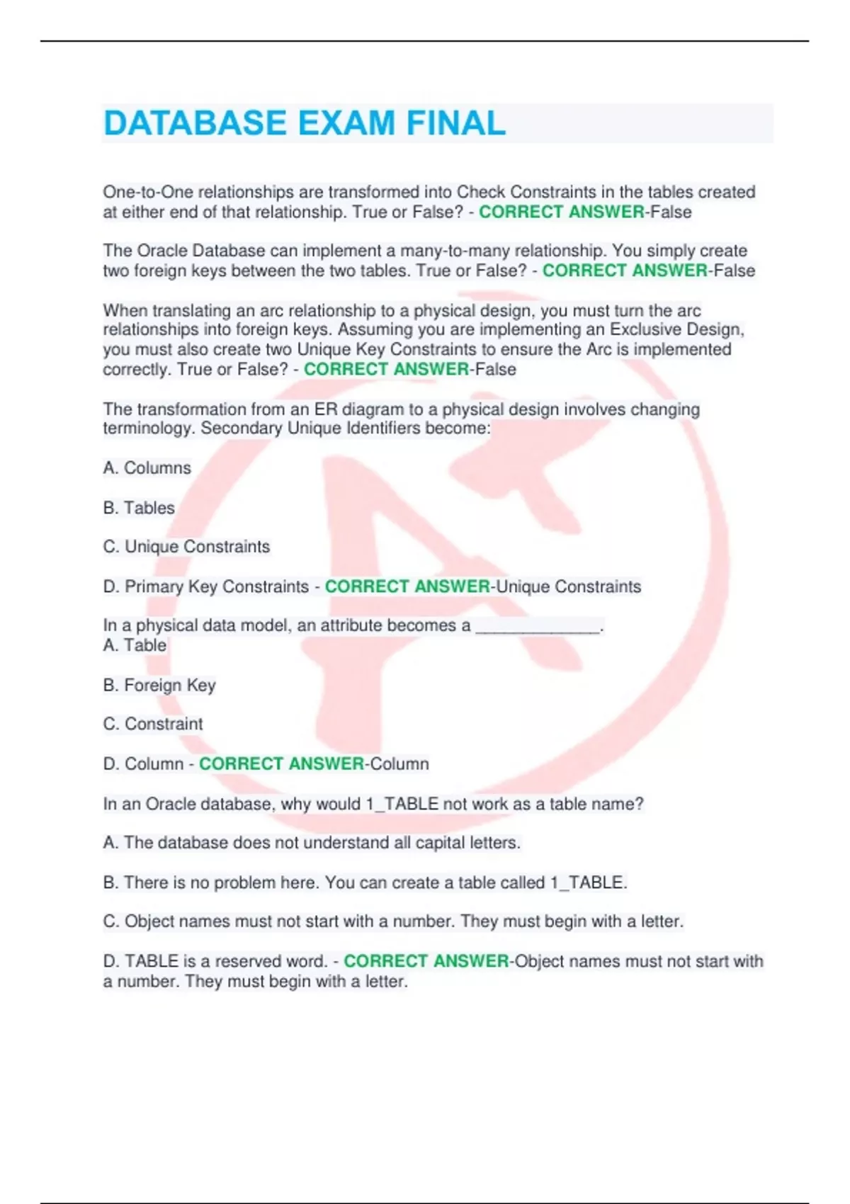 D. Primary Key Constraints - CORRECT ANSWER-Unique Constraints