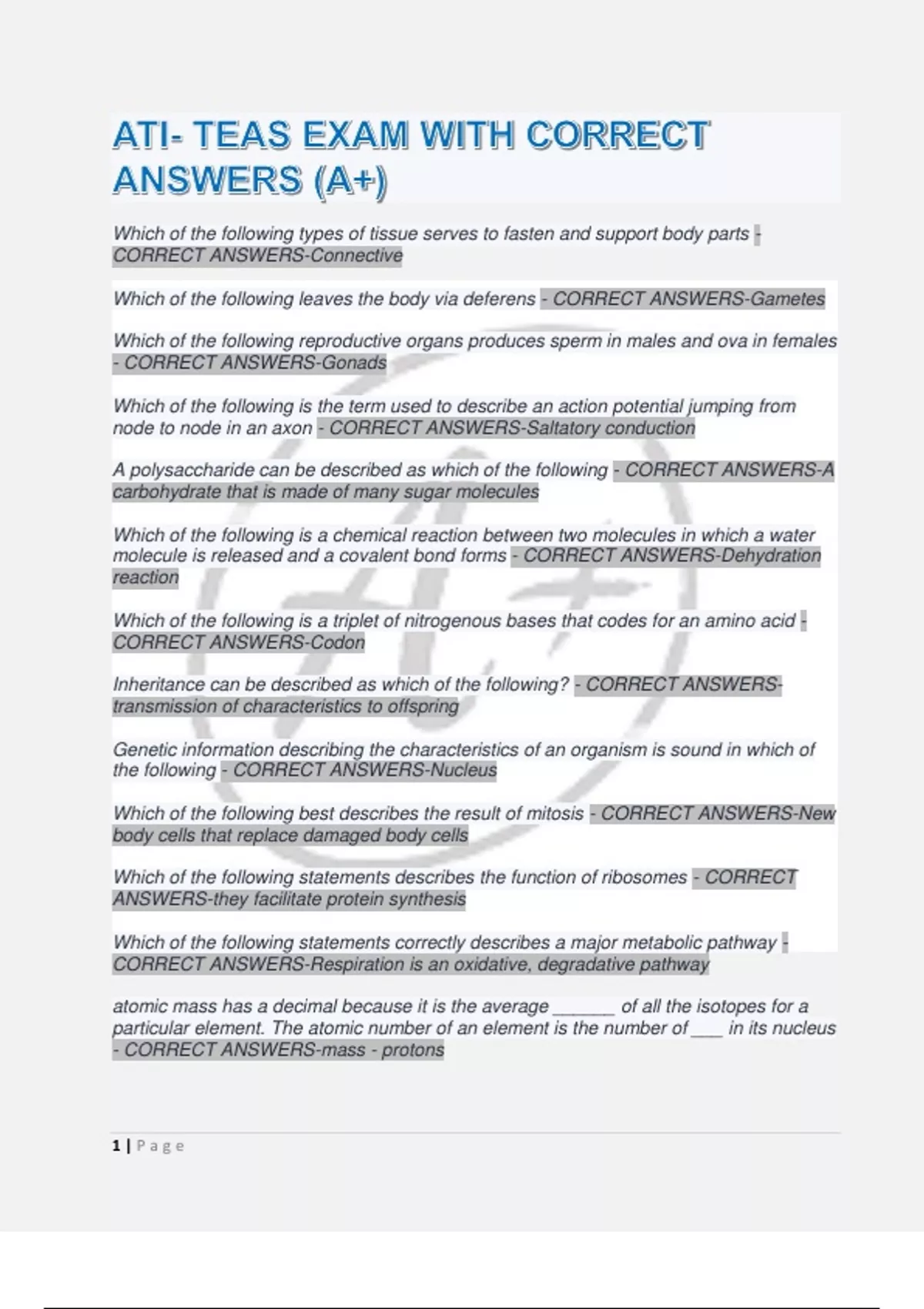 Which of the following is a triplet of nitrogenous bases that codes for an amino acid - CORRECT ANSWERS-Codon Inheritance can be described as which of the following? - CORRECT ANSWERS-transmission of characteristics to offspring Genetic information describing the characteristics of an organism is sound in which of the following - CORRECT ANSWERS-Nucleus Which of the following best describes the result of mitosis - CORRECT ANSWERS-New body cells that replace damaged body cells Which of the following statements describes the function of ribosomes - CORRECT ANSWERS-they facilitate protein synthesis Which of the following statements correctly describes a major metabolic pathway - CORRECT ANSWERS-Respiration is an oxidative, degradative pathway atomic mass has a decimal because it is the average ______ of all the isotopes for a particular element. The atomic number of an element is the number of ___ in its nucleus - CORRECT ANSWERS-mass - protons Does bacteria have a nucleus? - CORRECT ANSWERS-NO What is bacteria considered? - CORRECT ANSWERS-prokaryotes what is a virus? - CORRECT ANSWERS-smaller than bacteria only seen with the microscope not considered alive because they cannot reproduce. what are protozoans? - CORRECT ANSWERS-they feed on other cells and divide what is fungi? - CORRECT ANSWERS-Eukaryotes, and have a nucleus what is infectious disease? - CORRECT ANSWERS-spread from one person to another. (bacteria, viruses, fungi) What is a communicable disease? - CORRECT ANSWERS-a disease that is spread from one host to another
