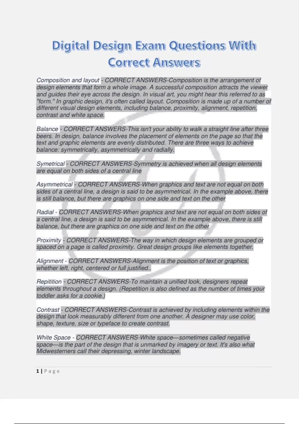 Asymmetrical - CORRECT ANSWERS-When graphics and text are not equal on both sides of a central line, a design is said to be asymmetrical. In the example above, there is still balance, but there are graphics on one side and text on the other Radial - CORRECT ANSWERS-When graphics and text are not equal on both sides of a central line, a design is said to be asymmetrical. In the example above, there is still balance, but there are graphics on one side and text on the other Proximity - CORRECT ANSWERS-The way in which design elements are grouped or spaced on a page is called proximity. Great design groups like elements together. Alignment - CORRECT ANSWERS-Alignment is the position of text or graphics, whether left, right, centered or full justified.. Repitition - CORRECT ANSWERS-To maintain a unified look, designers repeat elements throughout a design. (Repetition is also defined as the number of times your toddler asks for a cookie.) Contrast - CORRECT ANSWERS-Contrast is achieved by including elements within the design that look measurably different from one another. A designer may use color, shape, texture, size or typeface to create contrast. White Space - CORRECT ANSWERS-White space—sometimes called negative space—is the part of the design that is unmarked by imagery or text. It's also what Midwesterners call their depressing, winter landscape. Rule of Thirds - CORRECT ANSWERS-The rule of thirds is a technique that designers use to determine focal point. Using a grid of three rows and columns, focal points are indicated where the lines converge. Designers use this as a guide to determine where to place important elements in their design. Grid - CORRECT ANSWERS-A grid is a series of intersecting vertical, horizontal, angular or curved lines used to organize graphic elements on a page, as well as in relation to one another. Hierarchy - CORRECT ANSWERS-In design, hierarchy is the organization of elements by level of importance. Newspapers, magazine spreads and movie posters are good examples of the use of design hierarchy. Headlines (also called display type) are usually placed at the top, while subheads and body copy fall underneath Scale - CORRECT ANSWERS-Scale is the size of an object in relation to another object (not that thing in your bathroom that you curse at each morning). Scale can be used to create interest and grab a viewer's attention. Thumbnail Sketch - CORRECT ANSWERS-When conceptualizing, a designer will often create small, rough drawings—thumbnail sketches—to explore many ideas. Mock-Up - CORRECT ANSWERS-A mock-up is a real or digital model used to test early design ideas and see how they could look in the real world. Resoloution - CORRECT ANSWERS-The detail of an image based on the number of pixels is known as resolution. An image looks clearer when it has a higher resolution. DPI - CORRECT ANSWERS-DPI stands for "dots per inch," which is a measure of a printer's quality. For high-quality printing, 300dpi is recommended. For example, a 300dpi image at 1200×1800 pixels will become as a 4×6 inch print. PPI - CORRECT ANSWERS-PPI stands for "pixels per inch," which is a measure of pixel density used by electronic image devices. You'll likely see this used with scanners, cameras, TVs or monitors. Learn more about the difference between DPI and PPI. Bleed - CORRECT ANSWERS-Sounds pretty gruesome, but bleed is when a design actually extends past its printed edge so there's no chance of white borders when it's trimmed down after printing.