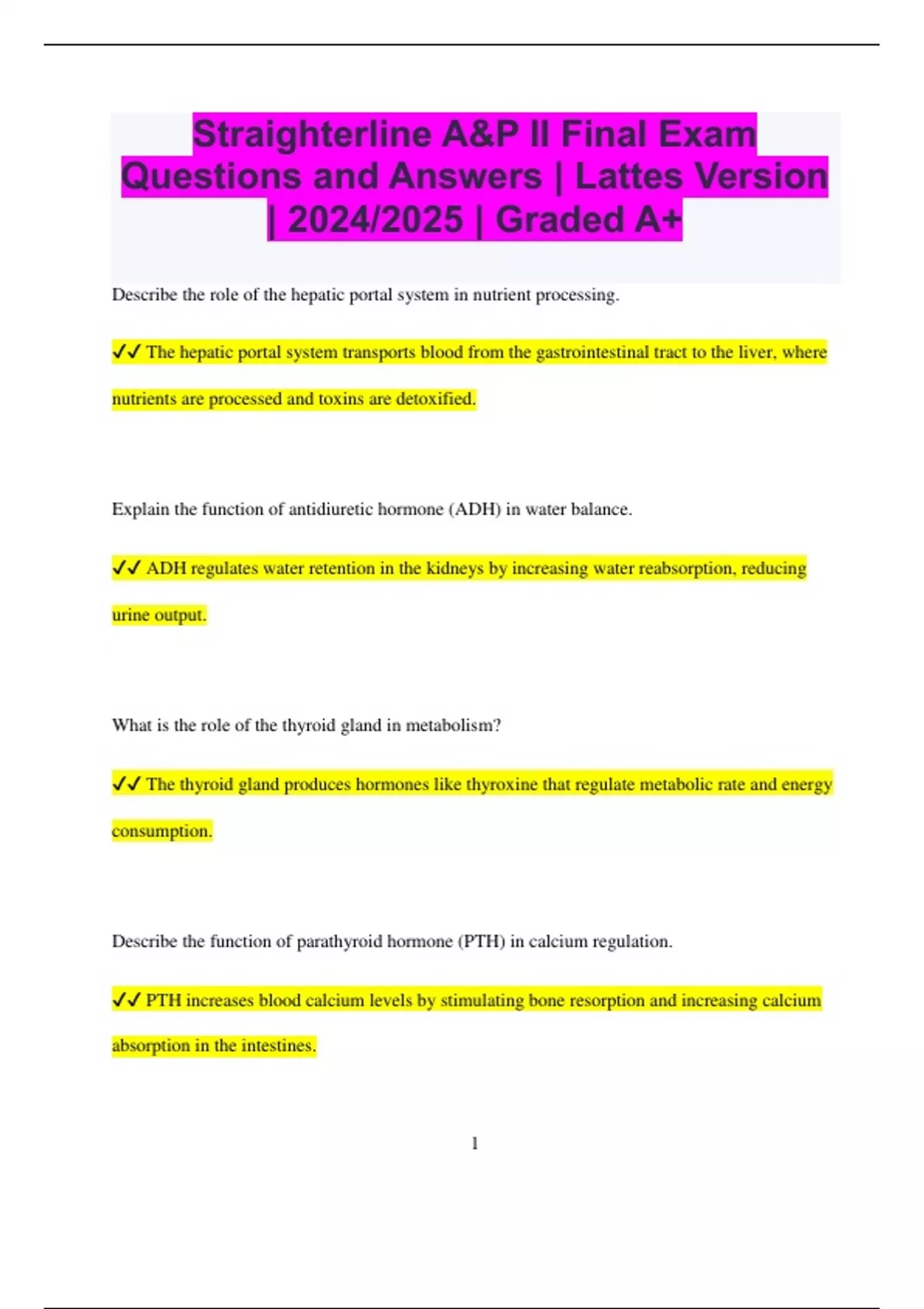 Straighterline A&P II Final Exam Questions and Answers | Lattes Version | 2024/2025 | Graded A+ Describe the role of the hepatic portal system in nutrient processing. The hepatic portal system transports blood from the gastrointestinal tract to the liver, where nutrients are processed and toxins are detoxified. Explain the function of antidiuretic hormone (ADH) in water balance. ADH regulates water retention in the kidneys by increasing water reabsorption, reducing urine output. What is the role of the thyroid gland in metabolism? The thyroid gland produces hormones like thyroxine that regulate metabolic rate and energy consumption. Describe the function of parathyroid hormone (PTH) in calcium regulation. PTH increases blood calcium levels by stimulating bone resorption and increasing calcium absorption in the intestines. 2 Explain the role of the autonomic nervous system in controlling involuntary functions. The autonomic nervous system regulates involuntary functions such as heart rate, digestion, and respiratory rate. What is the significance of erythropoietin in red blood cell production? Erythropoietin stimulates the production of red blood cells in response to low oxygen levels in the blood. Describe the function of the lymphatic system in immune defense. The lymphatic system transports lymph, which contains immune cells, throughout the body to help fight infections. Explain the role of insulin in blood sugar regulation. Insulin facilitates the uptake of glucose by cells, lowering blood sugar levels. What is the function of the adrenal medulla in the fight-or-flight response? The adrenal medulla releases adrenaline and noradrenaline, which prepare the body for a rapid response to stress.