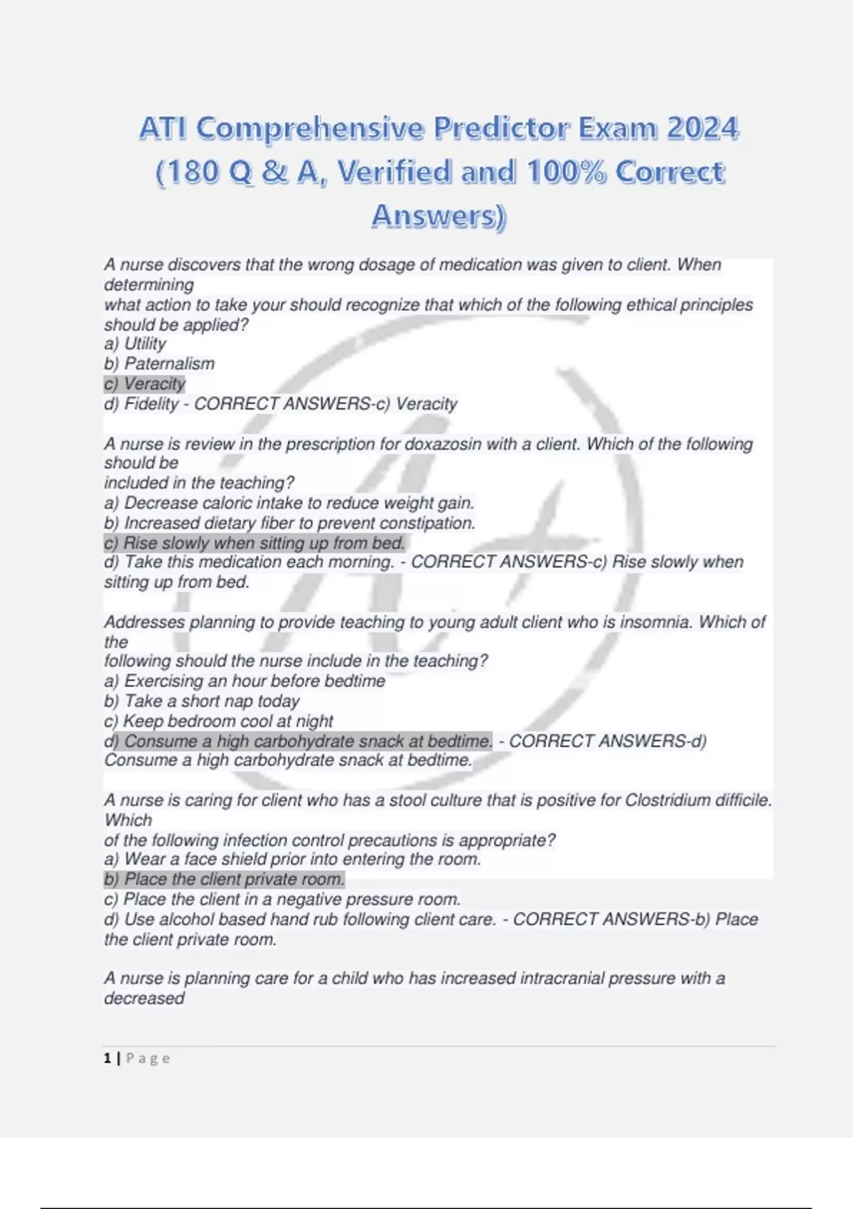 ATI Comprehensive Predictor Exam 2024 (180 Q & A, Verified and 100- Correct Answers)