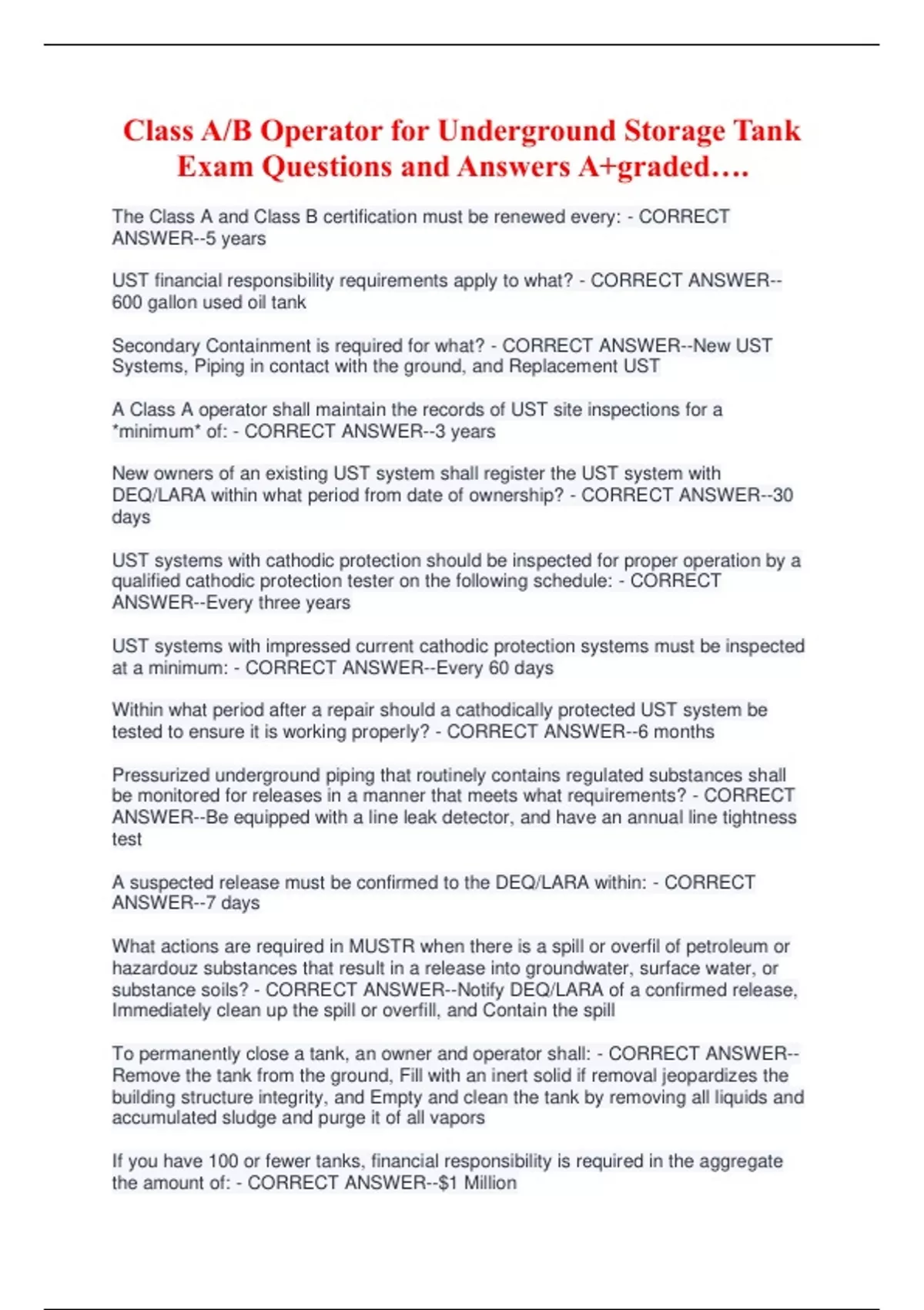Class A/B Operator for Underground Storage Tank Exam Questions and Answers A+graded…. The Class A and Class B certification must be renewed every: - CORRECT ANSWER--5 years UST financial responsibility requirements apply to what? - CORRECT ANSWER-- 600 gallon used oil tank Secondary Containment is required for what? - CORRECT ANSWER--New UST Systems, Piping in contact with the ground, and Replacement UST A Class A operator shall maintain the records of UST site inspections for a *minimum* of: - CORRECT ANSWER--3 years New owners of an existing UST system shall register the UST system with DEQ/LARA within what period from date of ownership? - CORRECT ANSWER--30 days UST systems with cathodic protection should be inspected for proper operation by a qualified cathodic protection tester on the following schedule: - CORRECT ANSWER--Every three years UST systems with impressed current cathodic protection systems must be inspected at a minimum: - CORRECT ANSWER--Every 60 days Within what period after a repair should a cathodically protected UST system be tested to ensure it is working properly? - CORRECT ANSWER--6 months Pressurized underground piping that routinely contains regulated substances shall be monitored for releases in a manner that meets what requirements? - CORRECT ANSWER--Be equipped with a line leak detector, and have an annual line tightness test