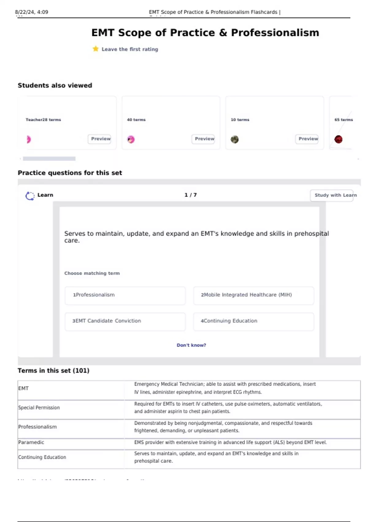 , 8/22/24, 4:09 EMT Scope of Practice & Professionalism Flashcards |