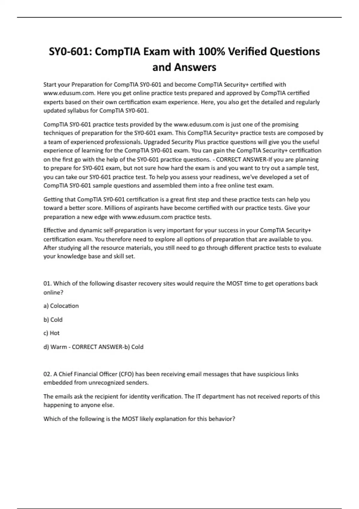 SY0-601: CompTIA Exam with 100% Verified Questions and Answers Start your Preparation for CompTIA SY0-601 and become CompTIA Security+ certified with . Here you get online practice tests prepared and approved by CompTIA certified experts based on their own certification exam experience. Here, you also get the detailed and regularly updated syllabus for CompTIA SY0-601. CompTIA SY0-601 practice tests provided by the is just one of the promising techniques of preparation for the SY0-601 exam. This CompTIA Security+ practice tests are composed by a team of experienced professionals. Upgraded Security Plus practice questions will give you the useful experience of learning for the CompTIA SY0-601 exam. You can gain the CompTIA Security+ certification on the first go with the help of the SY0-601 practice questions. - CORRECT ANSWER-If you are planning to prepare for SY0-601 exam, but not sure how hard the exam is and you want to try out a sample test, you can take our SY0-601 practice test. To help you assess your readiness, we've developed a set of CompTIA SY0-601 sample questions and assembled them into a free online test exam. Getting that CompTIA SY0-601 certification is a great first step and these practice tests can help you toward a better score. Millions of aspirants have become certified with our practice tests. Give your preparation a new edge with practice tests. Effective and dynamic self-preparation is very important for your success in your CompTIA Security+ certification exam. You therefore need to explore all options of preparation that are available to you. After studying all the resource materials, you still need to go through different practice tests to evaluate your knowledge base and skill set. 01. Which of the following disaster recovery sites would require the MOST time to get operations back online? a) Colocation b) Cold c) Hot d) Warm - CORRECT ANSWER-b) Cold 02. A Chief Financial Officer (CFO) has been receiving email messages that have suspicious links embedded from unrecognized senders. The emails ask the recipient for identity verification. The IT department has not received reports of this happening to anyone else. Which of the following is the MOST likely explanation for this behavior? a) The CFO is the target of a whaling attack. b) The CFO is the target of identity fraud. c) The CFO is receiving spam that got past the mail filters. d) The CFO is experiencing an impersonation attack. - CORRECT ANSWER-a) The CFO is the target of a whaling attack.