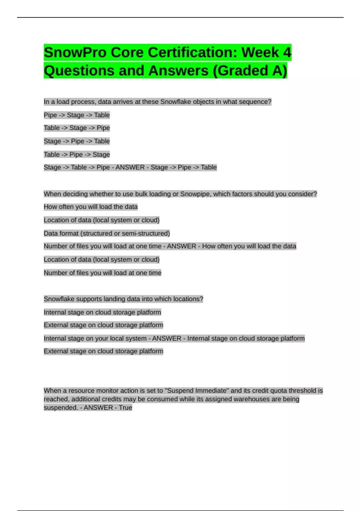 SnowPro Core Certification: Week 4 Questions and Answers (Graded A)SnowPro Core Certification: Week 4 Questions and Answers (Graded A)SnowPro Core Certification: Week 4 Questions and Answers (Graded A)SnowPro Core Certification: Week 4 Questions and Answers (Graded A)In a load process, data arrives at these Snowflake objects in what sequence? Pipe -> Stage -> Table Table -> Stage -> Pipe Stage -> Pipe -> Table Table -> Pipe -> Stage Stage -> Table -> Pipe - ANSWER - Stage -> Pipe -> Table When deciding whether to use bulk loading or Snowpipe, which factors should you consider? How often you will load the data Location of data (local system or cloud)