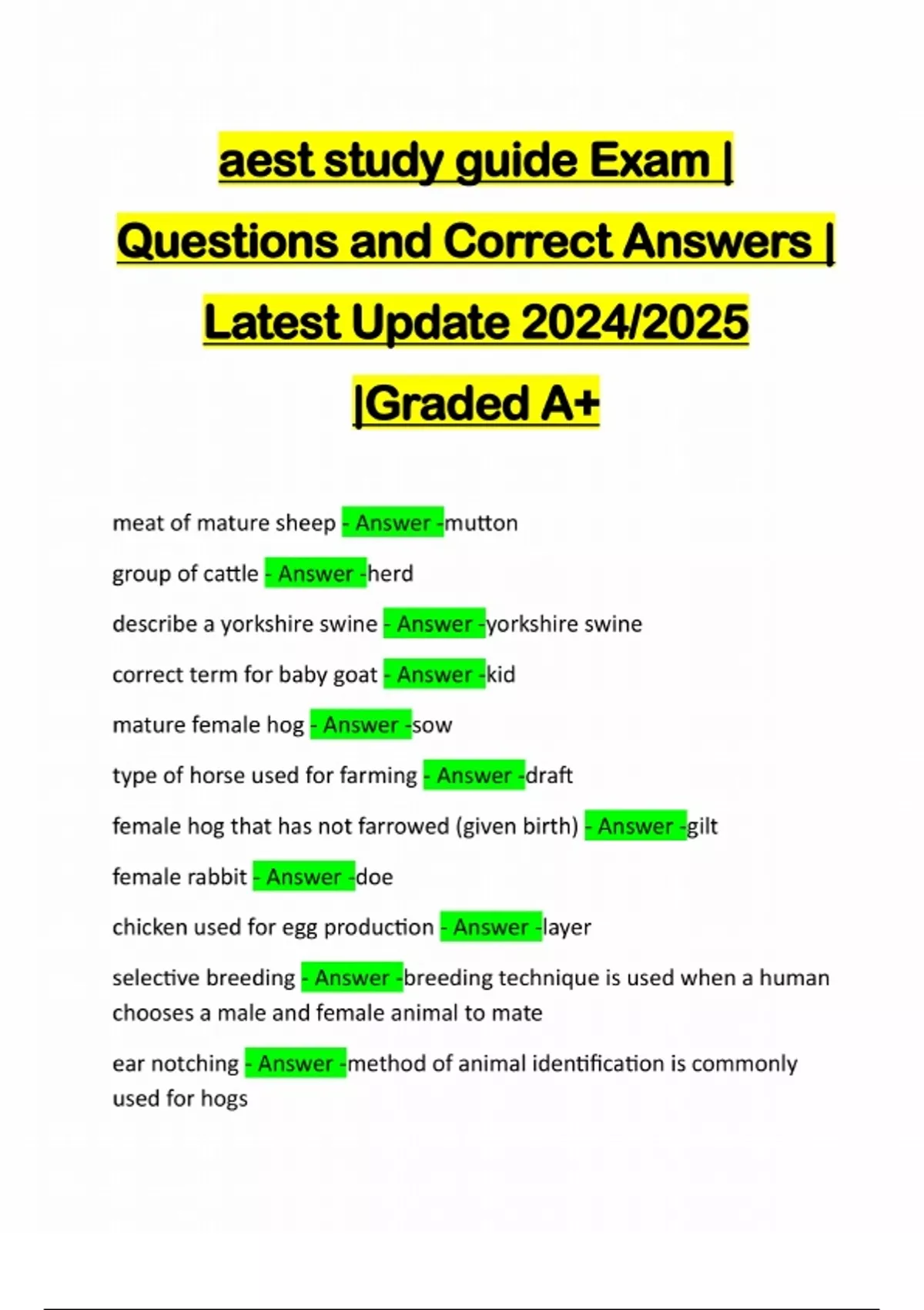 AEST STUDY GUIDE EXAM ACTUAL 2025/2026 QUESTIONS AND 100% CORRECT ANSWERS meat of mature sheep - Answer -mutton group of cattle - Answer -herd describe a yorkshire swine - Answer -yorkshire swine correct term for baby goat - Answer -kid mature female hog - Answer -sow type of horse used for farming - Answer -draft female hog that has not farrowed (given birth) - Answer -gilt female rabbit - Answer -doe chicken used for egg production -
