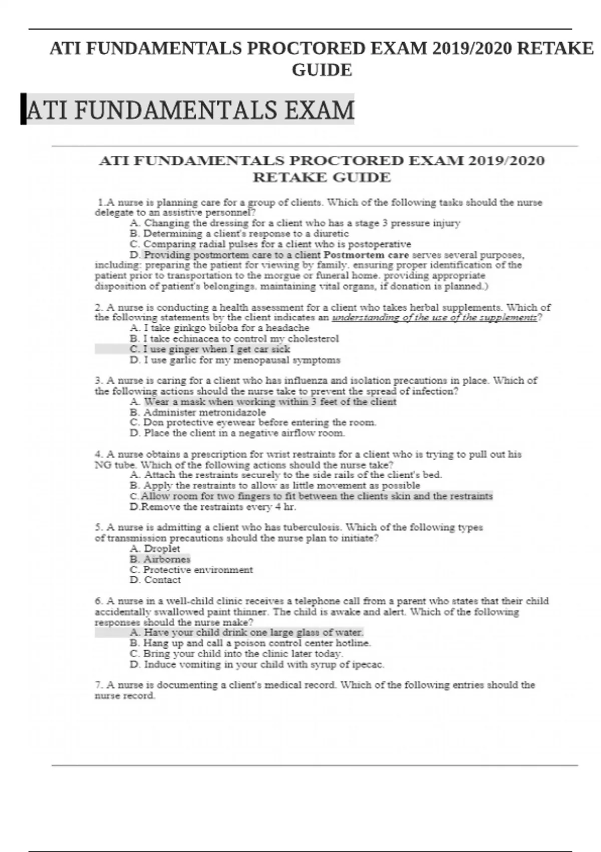 ATI FUNDAMENTALS PROCTORED EXAM RETAKE GUIDE Chamberlain College Of Nursing.