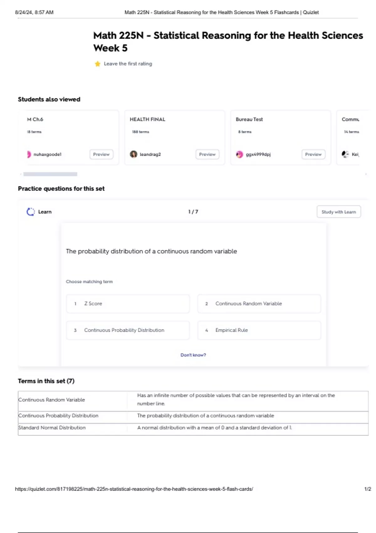 8/24/24, 8:57 AM Math 225N - Statistical Reasoning for the Health Sciences Week 5 Flashcards | Quizlet