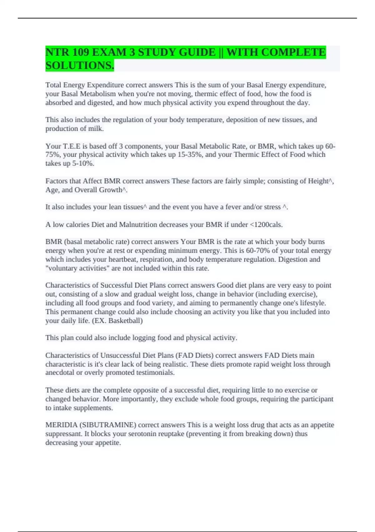 Total Energy Expenditure correct answers This is the sum of your Basal Energy expenditure, your Basal Metabolism when you're not moving, thermic effect of food, how the food is absorbed and digested, and how much physical activity you expend throughout the day. This also includes the regulation of your body temperature, deposition of new tissues, and production of milk. Your T.E.E is based off 3 components, your Basal Metabolic Rate, or BMR, which takes up 60-75%, your physical activity which takes up 15-35%, and your Thermic Effect of Food which takes up 5-10%. Factors that Affect BMR correct answers These factors are fairly simple; consisting of Height^, Age, and Overall Growth^. It also includes your lean tissues^ and the event you have a fever and/or stress ^. A low calories Diet and Malnutrition decreases your BMR if under <1200cals. BMR (basal metabolic rate) correct answers Your BMR is the rate at which your body burns energy when you're at rest or expending minimum energy. This is 60-70% of your total energy which includes your heartbeat, respiration, and body temperature regulation. Digestion and "voluntary activities" are not included within this rate. Characteristics of Successful Diet Plans correct answers Good diet plans are very easy to point out, consisting of a slow and gradual weight loss, change in behavior (including exercise), including all food groups and food variety, and aiming to permanently change one's lifestyle. This permanent change could also include choosing an activity you like that you included into your daily life. (EX. Basketball) This plan could also include logging food and physical activity. Characteristics of Unsuccessful Diet Plans (FAD Diets) correct answers FAD Diets main characteristic is it's clear lack of being realistic. These diets promote rapid weight loss through anecdotal or overly promoted testimonials. These diets are the complete opposite of a successful diet, requiring little to no exercise or changed behavior. More importantly, they exclude whole food groups, requiring the participant to intake supplements. MERIDIA (SIBUTRAMINE) correct answers This is a weight loss drug that acts as an appetite suppressant. It blocks your serotonin reuptake (preventing it from breaking down) thus decreasing your appetite.