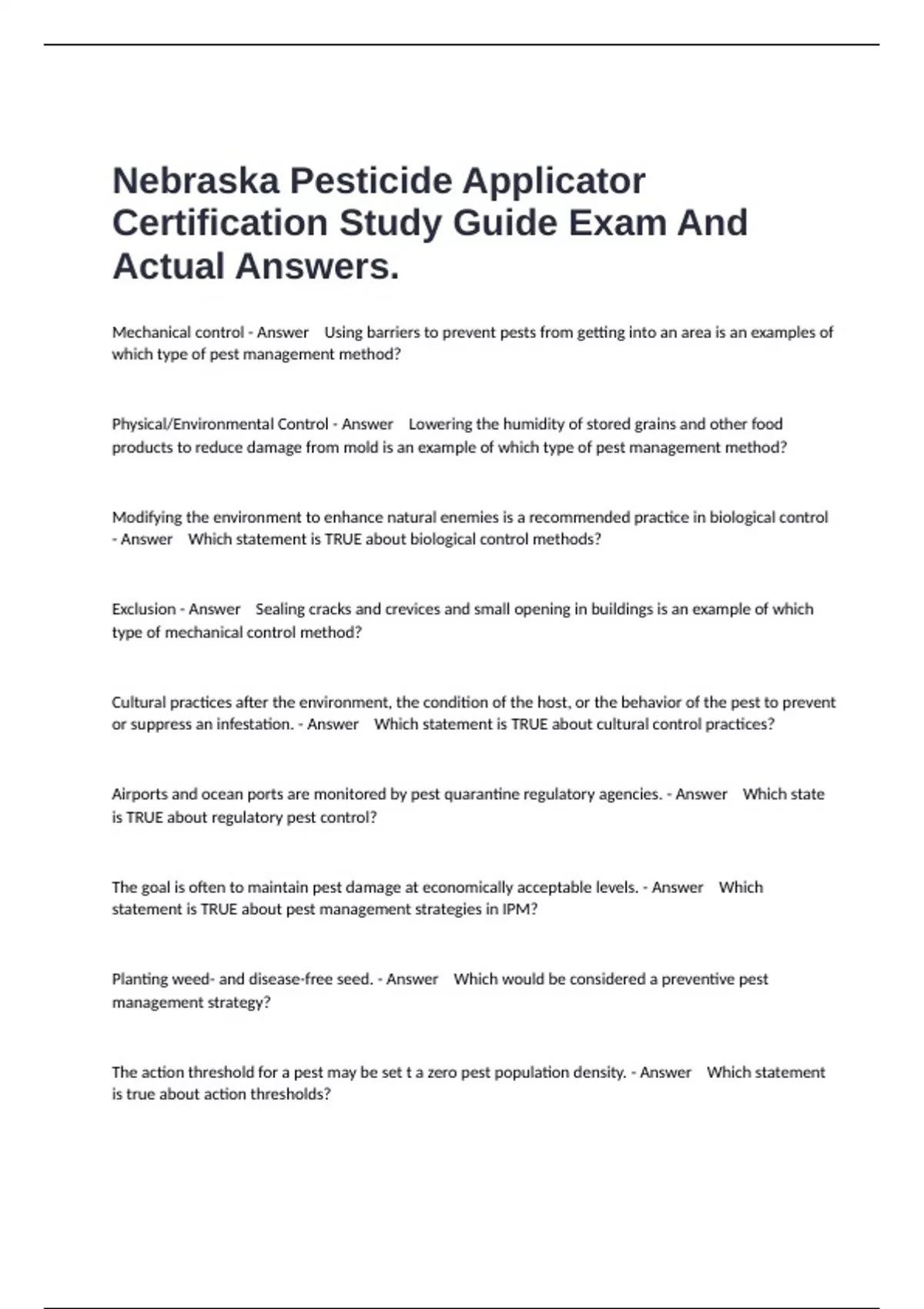 Nebraska Pesticide Applicator Certification Study Guide Exam And Actual Answers.