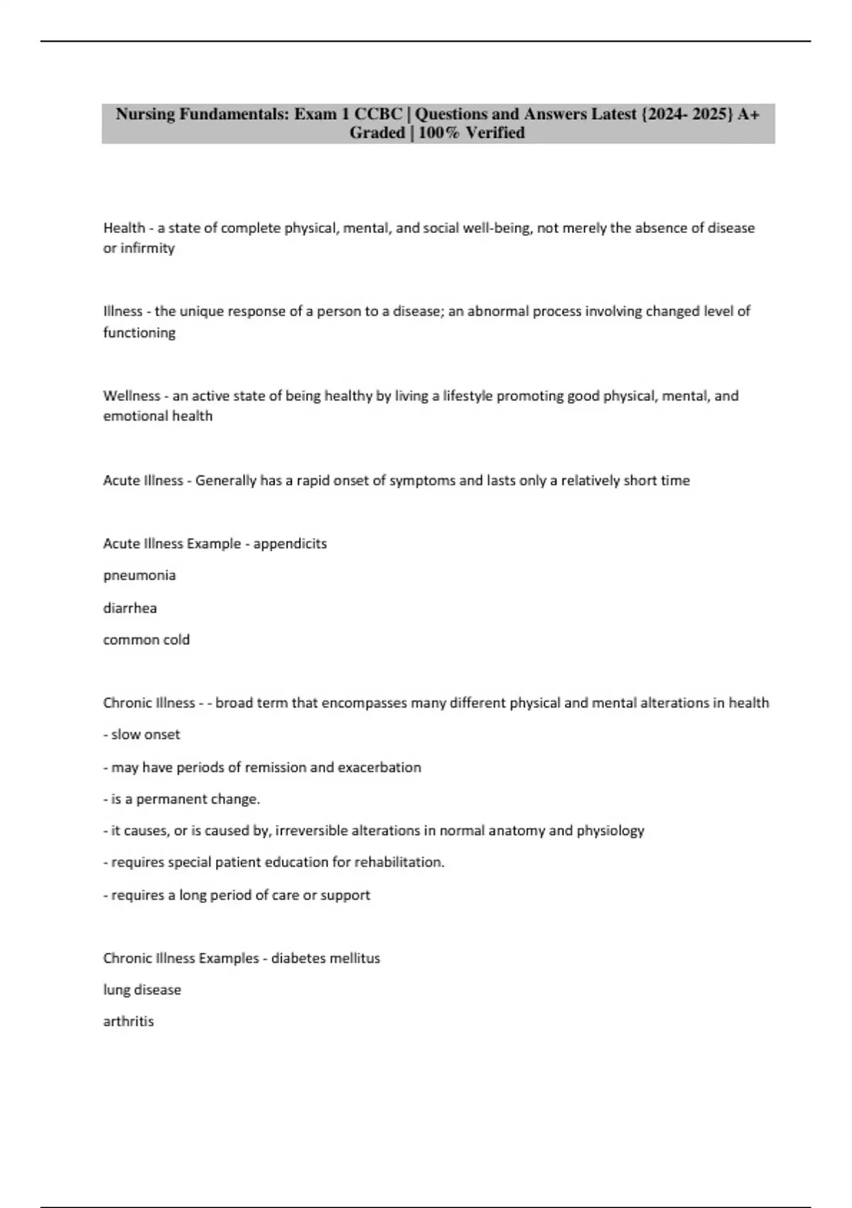 Nursing Fundamentals: Exam 1 CCBC | Questions and Answers Latest {} A+ Graded | 100% Verified
