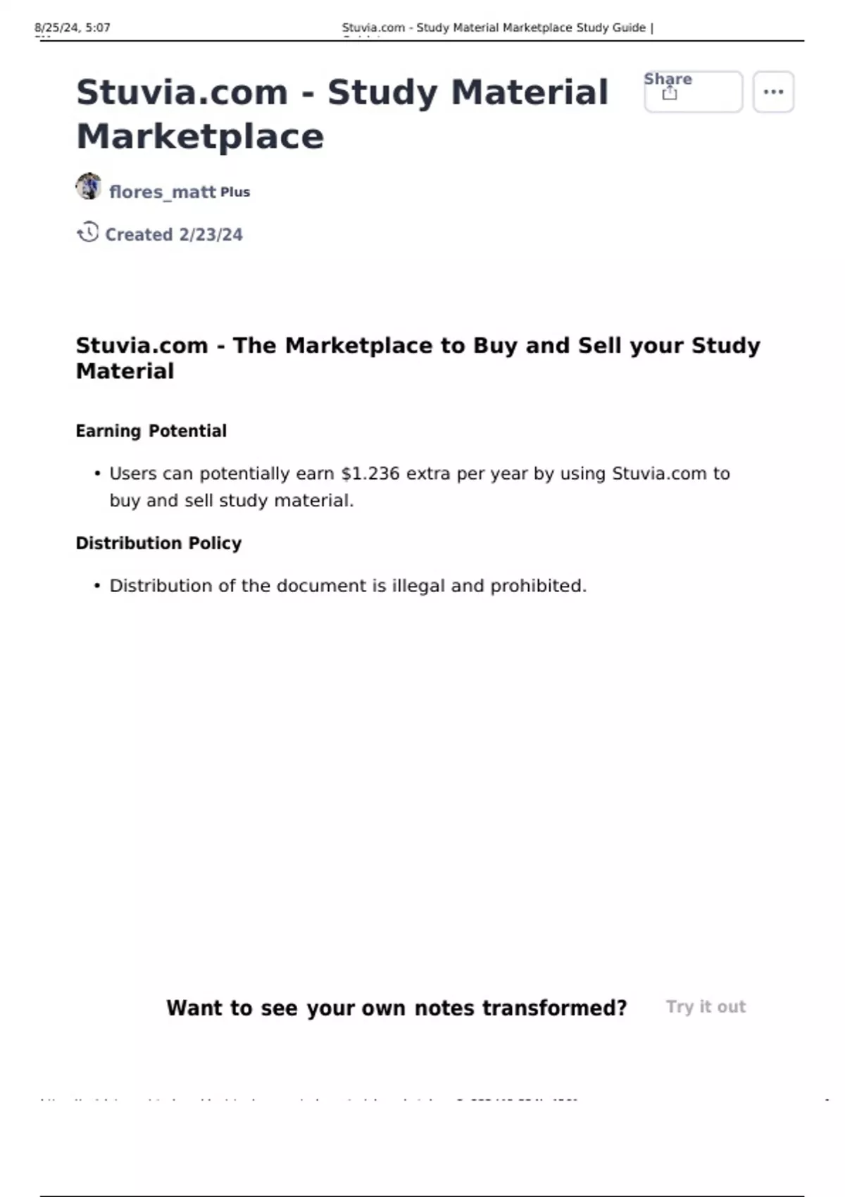 • Users can potentially earn $1.236 extra per year by using Stuvia.com to