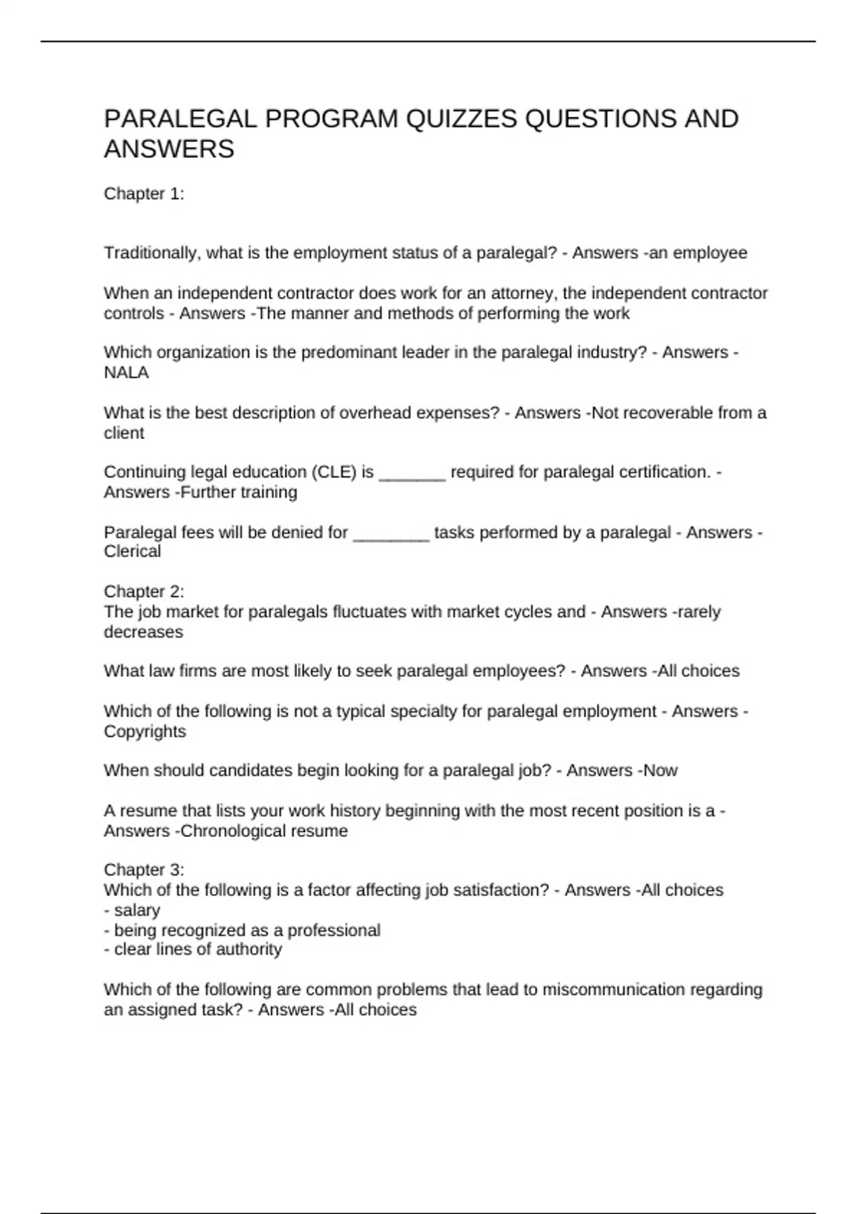 PARALEGAL PROGRAM QUIZZES QUESTIONS AND ANSWERS