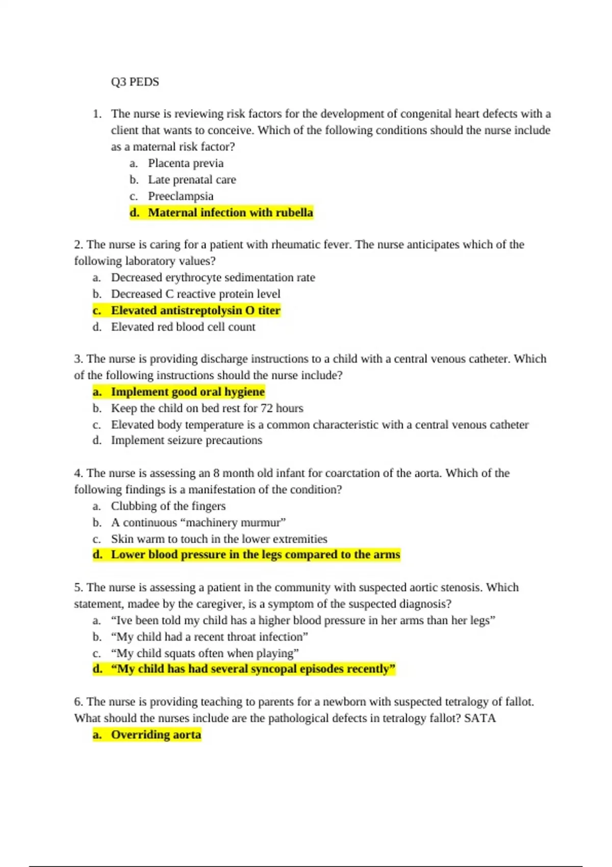 The document "Pediatric Quiz 3" is a study guide or review for a pediatric nursing quiz, focusing on key concepts related to child health, developmental milestones, common pediatric conditions, and their management. It likely includes practice questions, important terminology, and explanations.