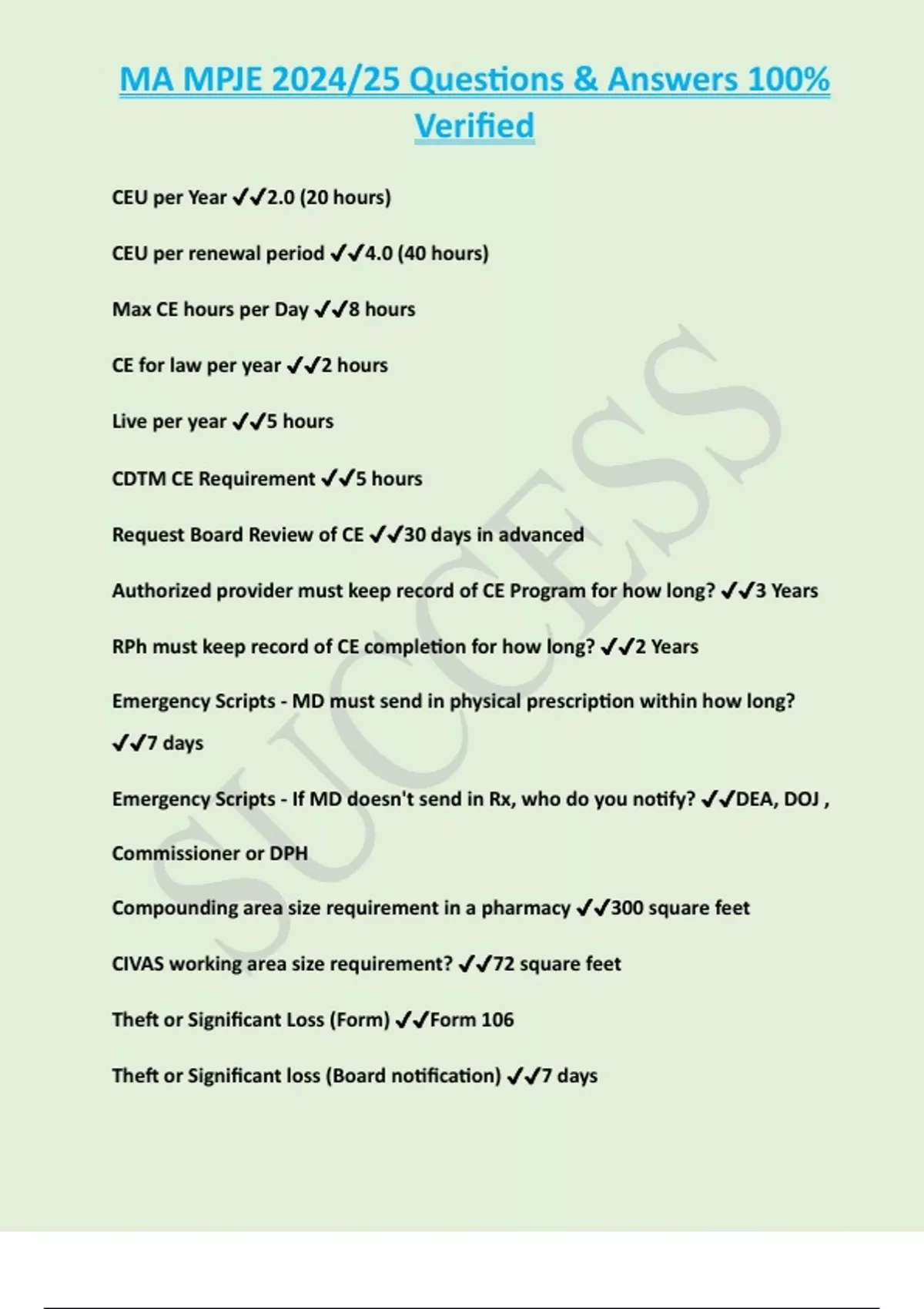 MA MPJE 2024/25 Questions & Answers 100% Verified CEU per Year 2.0 (20 hours) CEU per renewal period 4.0 (40 hours) Max CE hours per Day 8 hours CE for law per year 2 hours Live per year 5 hours CDTM CE Requirement 5 hours Request Board Review of CE 30 days in advanced Authorized provider must keep record of CE Program for how long? 3 Years RPh must keep record of CE completion for how long? 2 Years