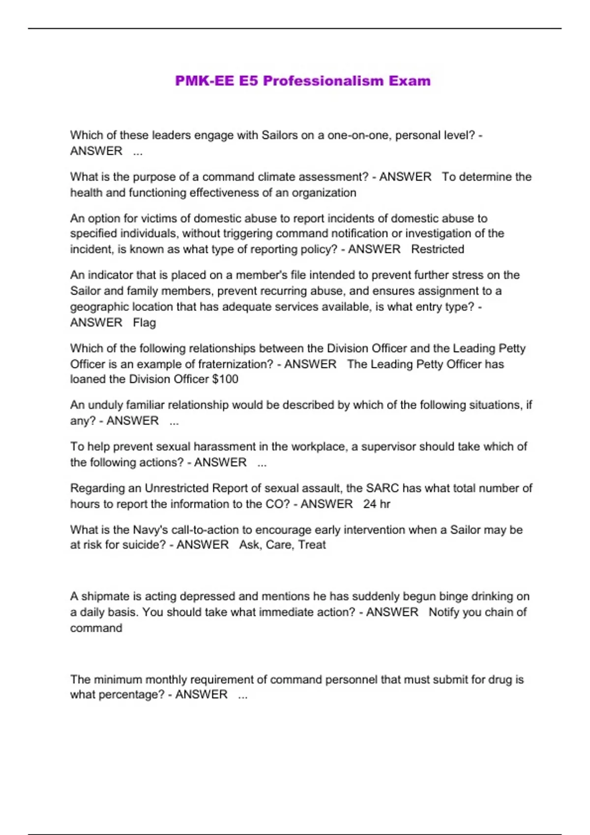 Which of these leaders engage with Sailors on a one-on-one, personal level? - ANSWER ... What is the purpose of a command climate assessment? - ANSWER To determine the health and functioning effectiveness of an organization An option for victims of domestic abuse to report incidents of domestic abuse to specified individuals, without triggering command notification or investigation of the incident, is known as what type of reporting policy? - ANSWER Restricted