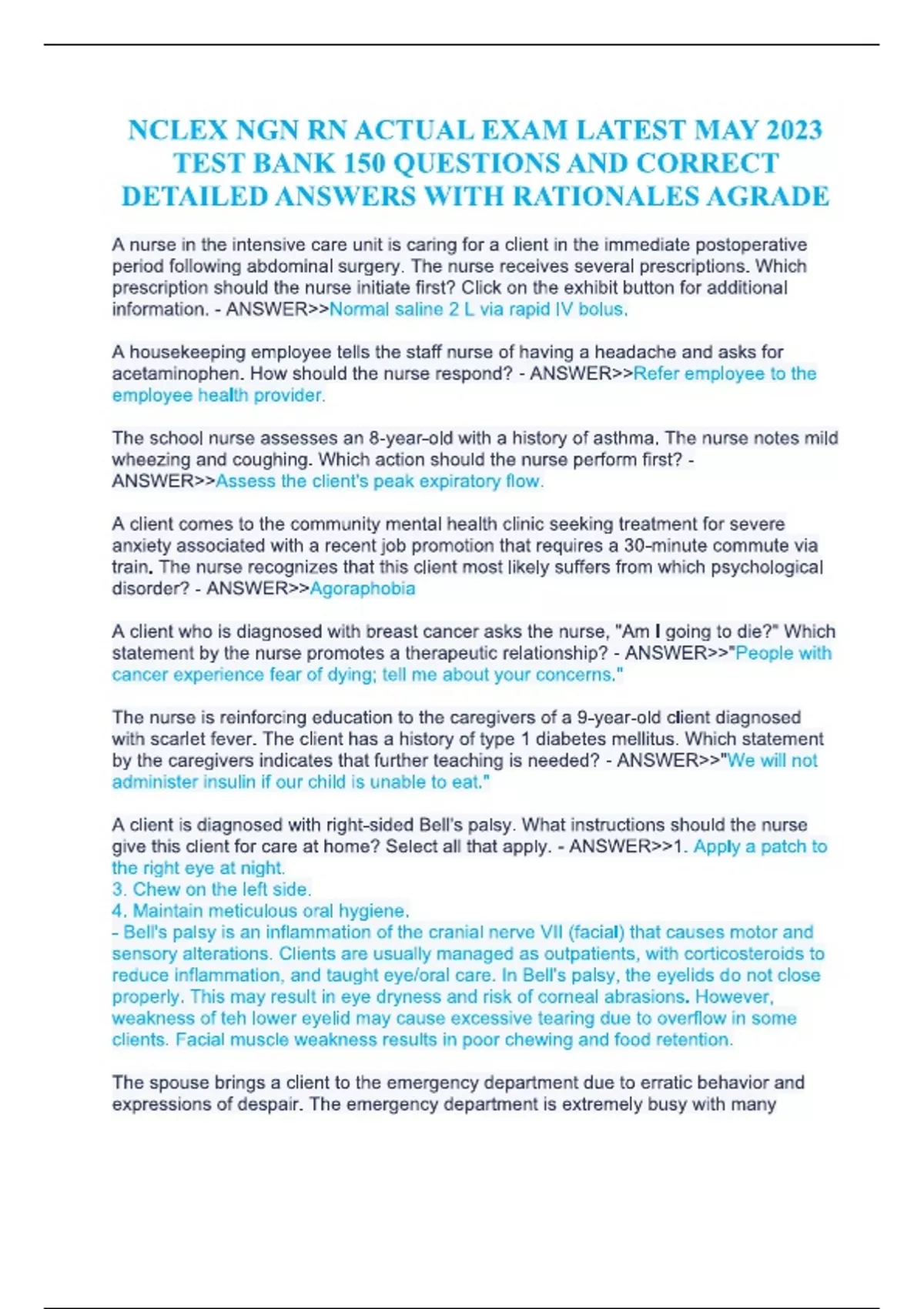 NCLEX NGN RN ACTUAL EXAM LATEST MAY 2023 TEST BANK 150 QUESTIONS AND CORRECT DETAILED ANSWERS WITH RATIONALES AGRADE