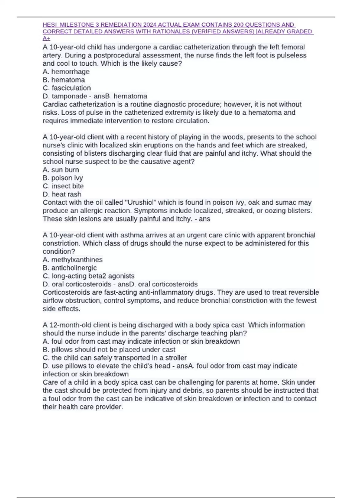 HESI MILESTONE 2 REMEDIATION ACTUAL EXAM CONTAINS 200 QUESTIONS AND CORRECT DETAILED ANSWERS WITH RATIONALES (VERIFIED ANSWERS) - ALREADY GRADED A+