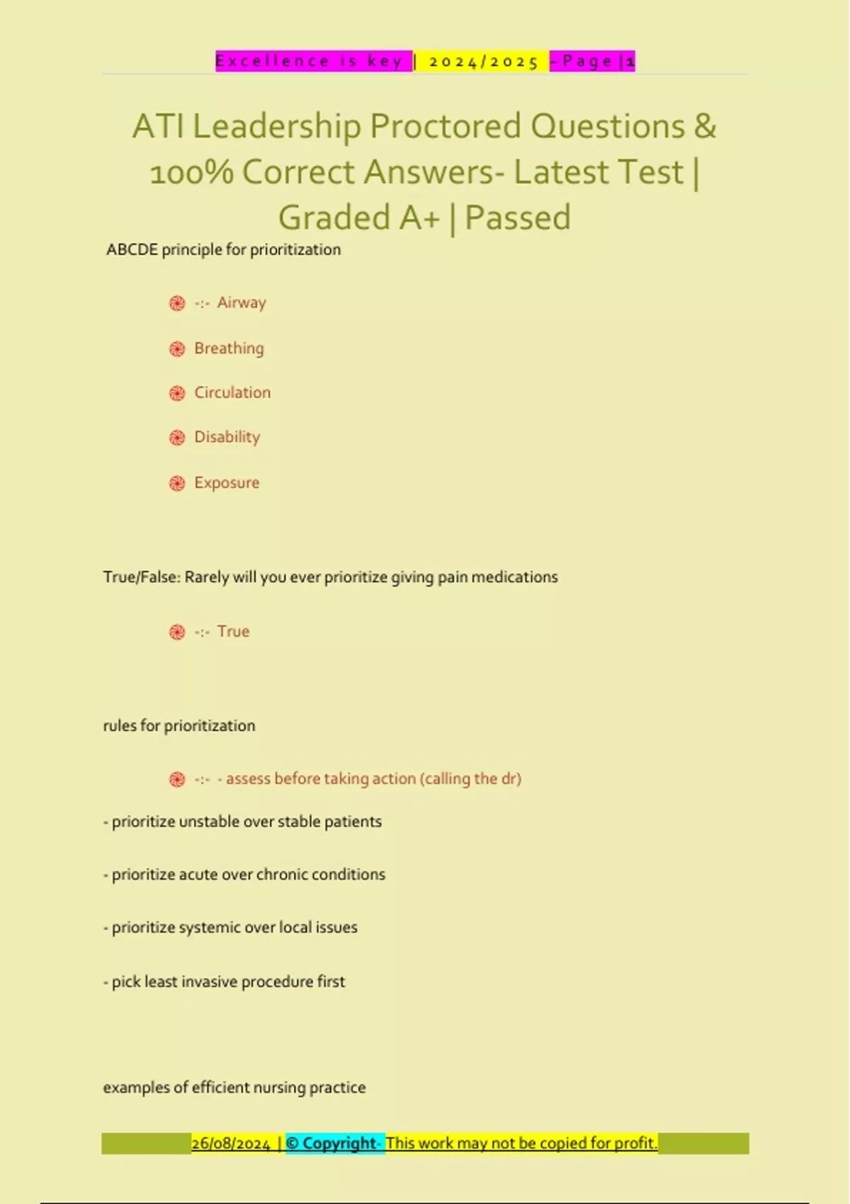 ABCDE principle for prioritization ֎ -:- Airway ֎ Breathing ֎ Circulation ֎ Disability ֎ Exposure True/False: Rarely will you ever prioritize giving pain medications ֎ -:- True rules for prioritization ֎ -:- - assess before taking action (calling the dr) - prioritize unstable over stable patients - prioritize acute over chronic conditions - prioritize systemic over local issues - pick least invasive procedure first examples of efficient nursing practice E x c e l l e n c e i s k e y | 2 0 2 4 / 2 0 2 5 ~ P a g e | 2 26/08/2024 | © Copyright- This work may not be copied for profit. ֎ -:- - take time at the beginning of your shift to plan and prioritize your day - chart interventions/nursing care as soon as you complete them - group tasks together for a single patient - complete time consuming or challenging tasks earlier in your shift - wait to perform non-essential tasks for later in the day 5 rights of delegation ֎ -:- - right task - right circumstance - right person - right direction/communication - right supervision and evaluation what can be delegated to LPN's ֎ -:- medications enteral feeding foley insertions suctioning trach car