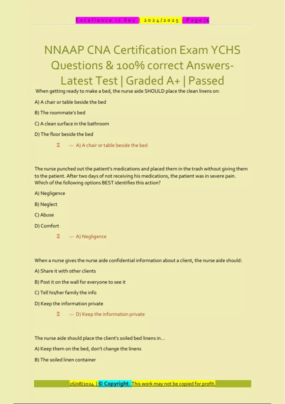 NNAAP CNA Certification Exam YCHS Questions & 100% correct AnswersLatest Test | Graded A+ | Passed