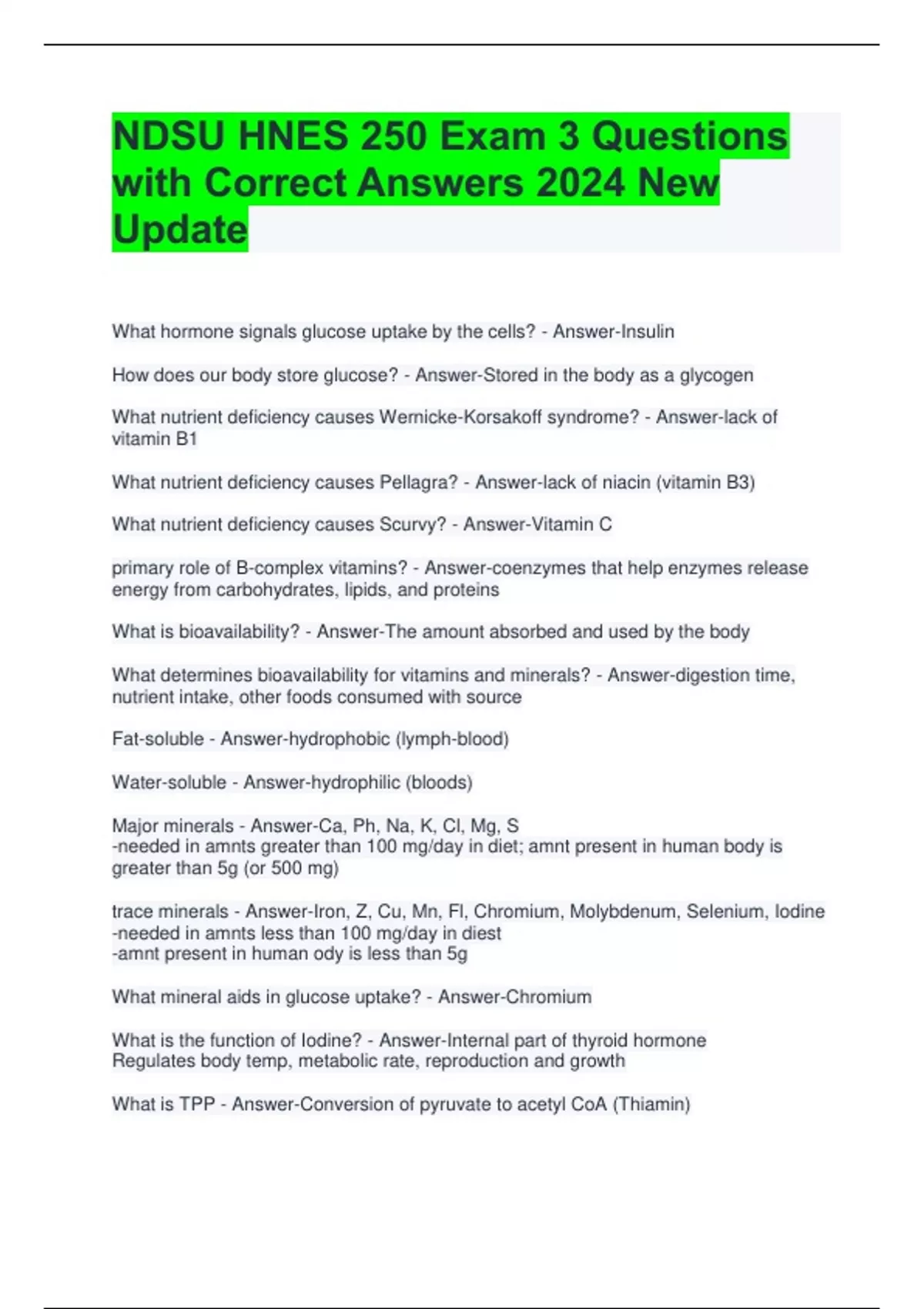NDSU HNES 250 Exam 3 Questions with Correct Answers 2024 New Update What hormone signals glucose uptake by the cells? - Answer-Insulin How does our body store glucose? - Answer-Stored in the body as a glycogen What nutrient deficiency causes Wernicke-Korsakoff syndrome? - Answer-lack of vitamin B1 What nutrient deficiency causes Pellagra? - Answer-lack of niacin (vitamin B3) What nutrient deficiency causes Scurvy? - Answer-Vitamin C primary role of B-complex vitamins? - Answer-coenzymes that help enzymes release energy from carbohydrates, lipids, and proteins What is bioavailability? - Answer-The amount absorbed and used by the body What determines bioavailability for vitamins and minerals? - Answer-digestion time, nutrient intake, other foods consumed with source Fat-soluble - Answer-hydrophobic (lymph-blood) Water-soluble - Answer-hydrophilic (bloods) Major minerals - Answer-Ca, Ph, Na, K, Cl, Mg, S -needed in amnts greater than 100 mg/day in diet; amnt present in human body is greater than 5g (or 500 mg) trace minerals - Answer-Iron, Z, Cu, Mn, Fl, Chromium, Molybdenum, Selenium, Iodine -needed in amnts less than 100 mg/day in diest -amnt present in human ody is less than 5g What mineral aids in glucose uptake? - Answer-Chromium What is the function of Iodine? - Answer-Internal part of thyroid hormone Regulates body temp, metabolic rate, reproduction and growth