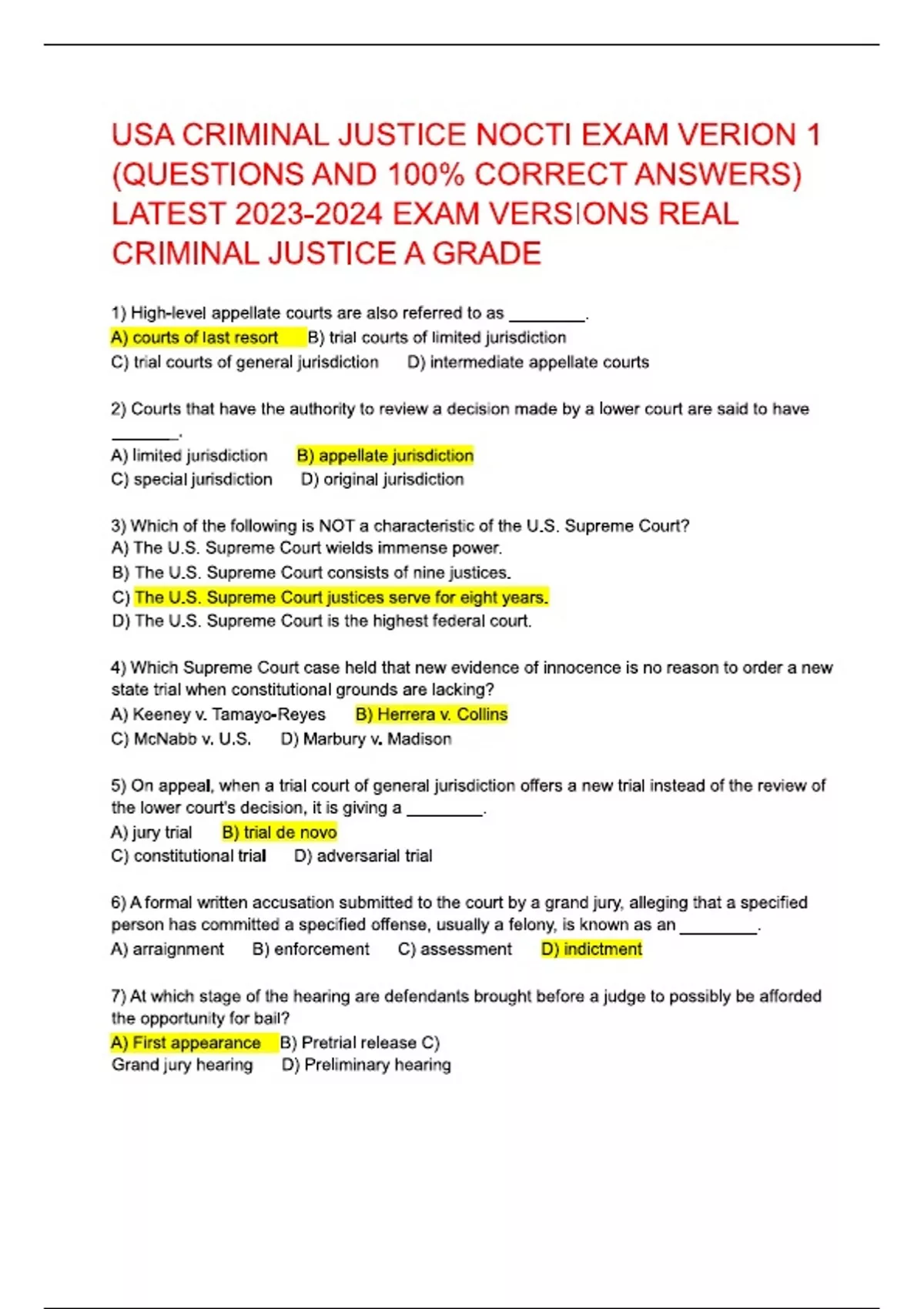 USA CRIMINAL JUSTICE NOCTI EXAM VERION 1 (QUESTIONS AND 100 CORRECT ANSWERS) LATEST EXAM VERSIONS REAL CRIMINAL JUSTICE A GRADE