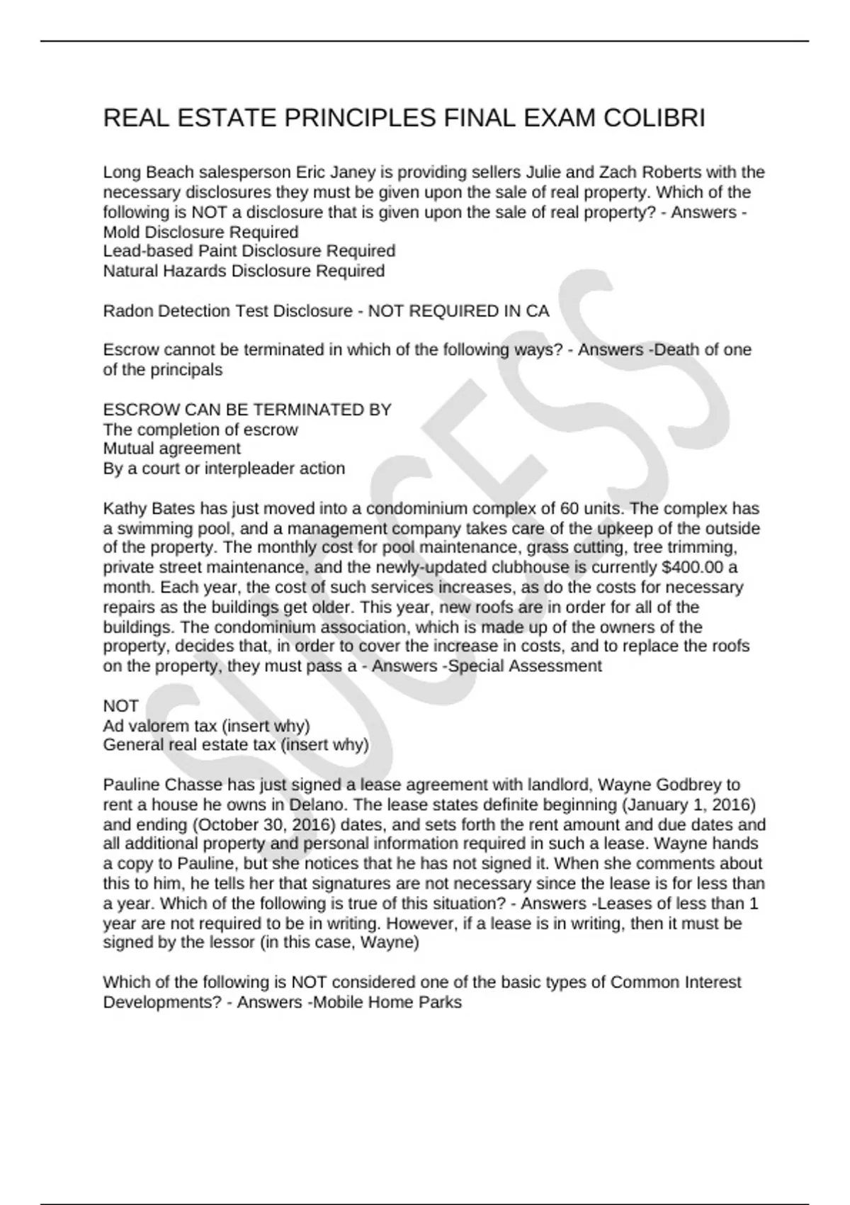 REAL ESTATE PRINCIPLES FINAL EXAM COLIBRI