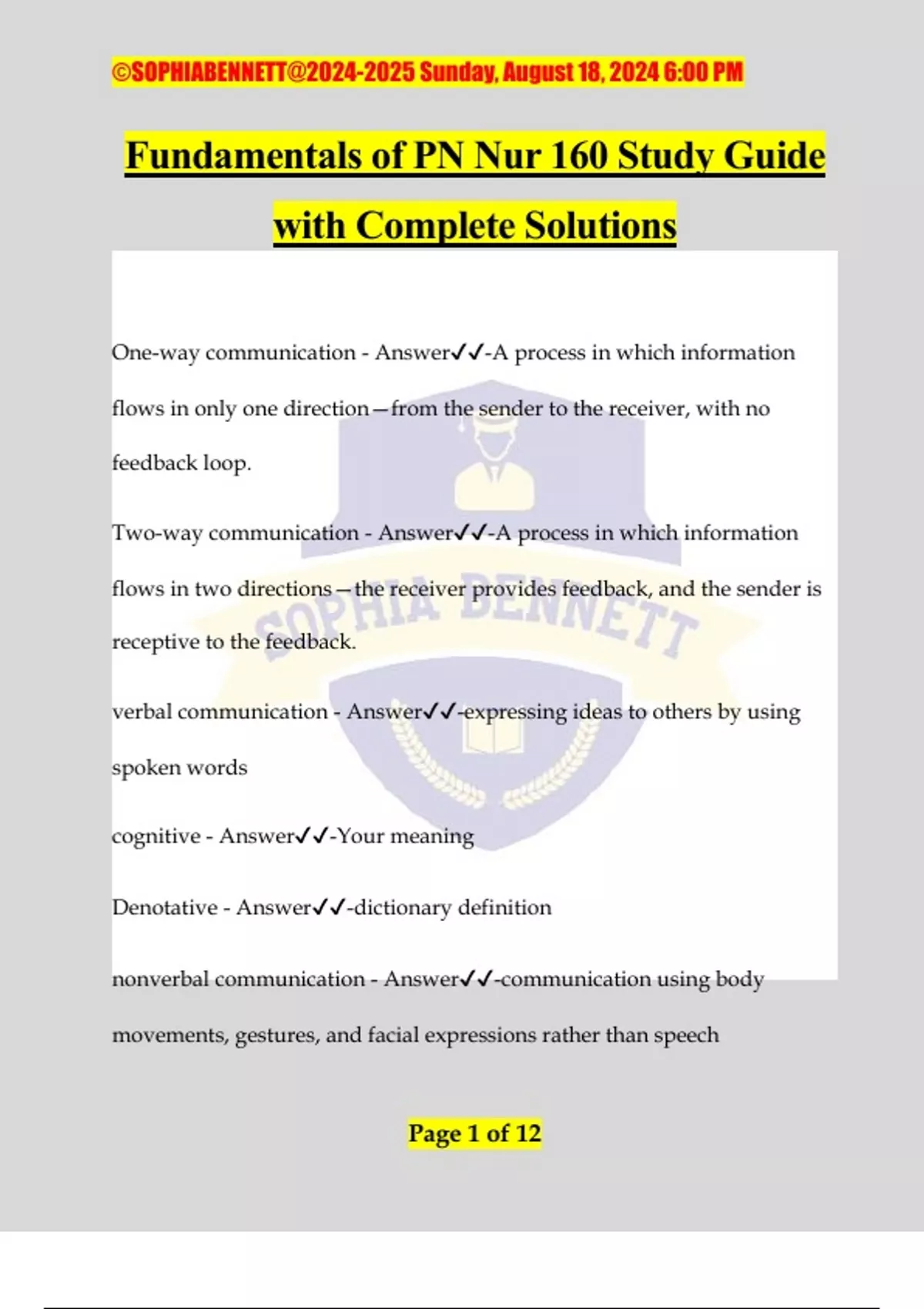 Fundamentals of PN Nur 160 Study Guide with Complete Solutions One-way communication - Answer️️ -A process in which information flows in only one direction—from the sender to the receiver, with no feedback loop. Two-way communication - Answer️️ -A process in which information flows in two directions—the receiver provides feedback, and the sender is receptive to the feedback. verbal communication - Answer️️ -expressing ideas to others by using spoken words cognitive - Answer️️ -Your meaning Denotative - Answer️️ -dictionary definition nonverbal communication - Answer️️ -communication using body movements, gestures, and facial expressions rather than speech ©SOPHIABENNETT@ Sunday, August 18, 2024 6:00 PM Page 2 of 12 assertive communication - Answer️️ -communication that takes a listener's feelings and rights into account aggressive communication - Answer️️ -self-serving communication that does not take a listener's feelings and rights into account and is overpowering and forceful AVOID! Unassertive Communication - Answer️️ -Aggressing to do what is requested and can create additional problems Therapeutic communication for nurses - Answer️️ -Interaction between a nurse and the patient is caring, sincere, empathetic, and trustworthy, we want to establish a therapeutic relationship Non-therapeutic communication - Answer️️ -Blocks the development of a trust and therapeutic relationship, AVOID! Communication - Answer️️ -A process through which you send messages to and receive messages from others. What are the 6 rights of medication administration? - Answer️️ -right drug, right dose, right route, right time, right Pt, right doc