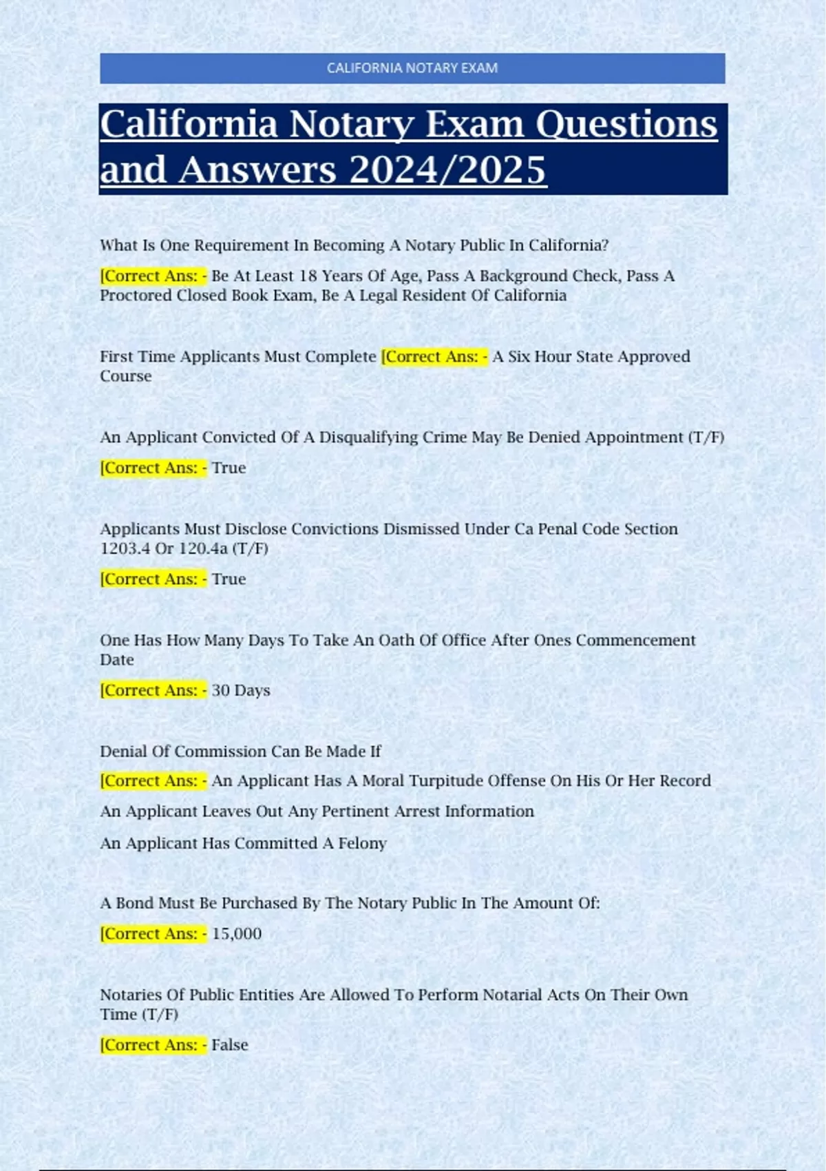 California Notary Exam Questions and Answers 2024/2025 What Is One Requirement In Becoming A Notary Public In California? [Correct Ans: - Be At Least 18 Years Of Age, Pass A Background Check, Pass A Proctored Closed Book Exam, Be A Legal Resident Of California First Time Applicants Must Complete [Correct Ans: - A Six Hour State Approved Course An Applicant Convicted Of A Disqualifying Crime May Be Denied Appointment (T/F) [Correct Ans: - True Applicants Must Disclose Convictions Dismissed Under Ca Penal Code Section 1203.4 Or 120.4a (T/F) [Correct Ans: - True One Has How Many Days To Take An Oath Of Office After Ones Commencement Date [Correct Ans: - 30 Days Denial Of Commission Can Be Made If [Correct Ans: - An Applicant Has A Moral Turpitude Offense On His Or Her Record An Applicant Leaves Out Any Pertinent Arrest Information An Applicant Has Committed A Felony A Bond Must Be Purchased By The Notary Public In The Amount Of: [Correct Ans: - 15,000 Notaries Of Public Entities Are Allowed To Perform Notarial Acts On Their Own Time (T/F) [Correct Ans: - False