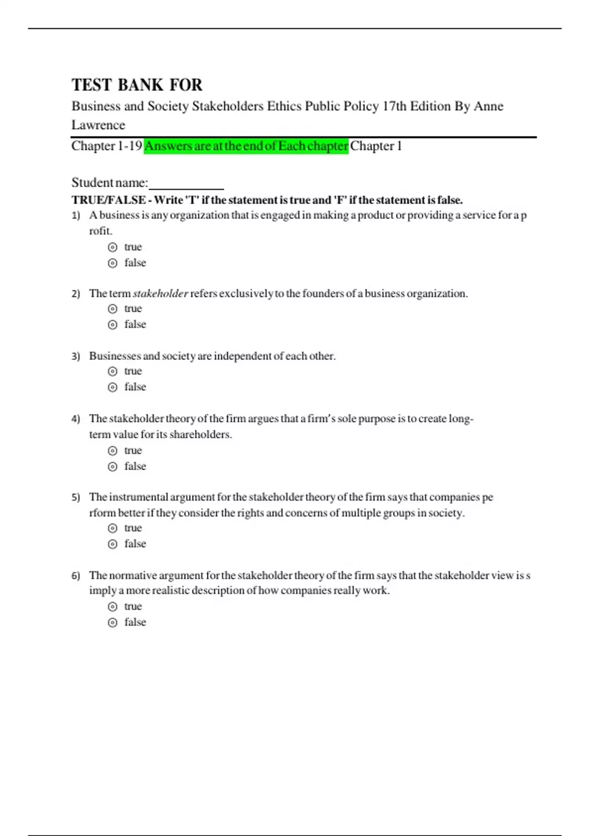 TEST BANK FOR Business and Society Stakeholders Ethics Public Policy 17th Edition By Anne