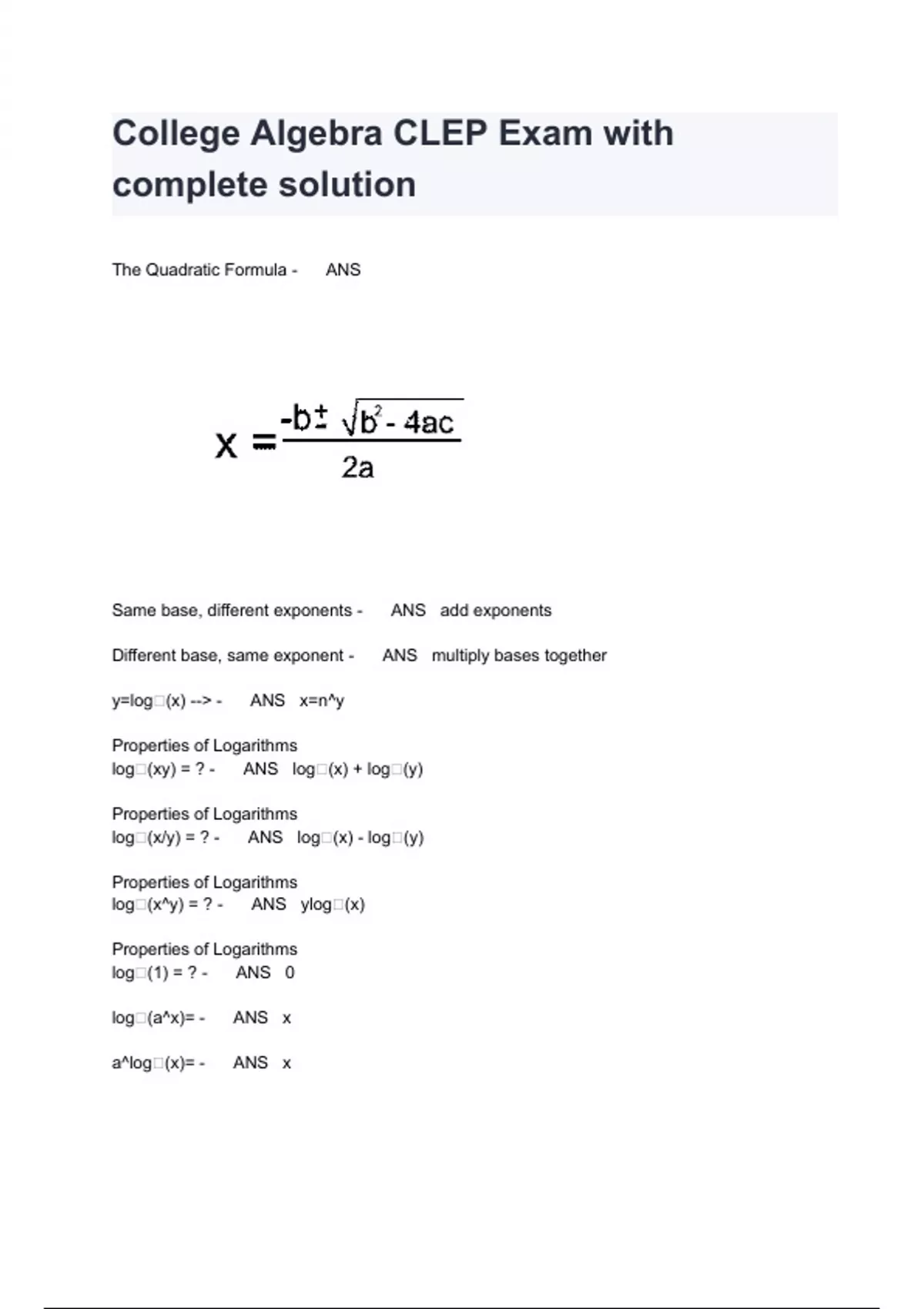 College Algebra CLEP Exam with complete solution