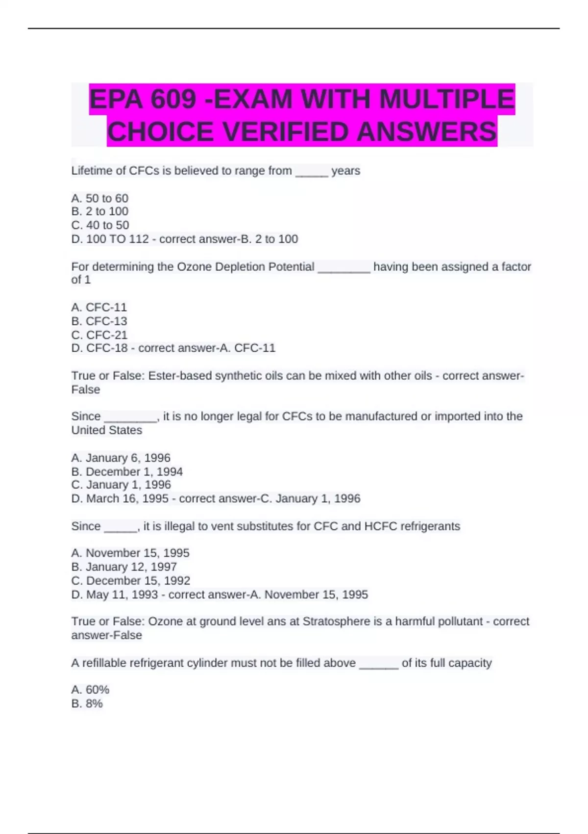EPA 609 -EXAM WITH MULTIPLE CHOICE VERIFIED ANSWERS
