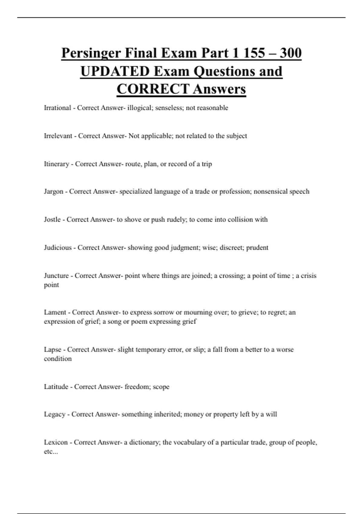 Persinger Final Exam Part 1 155 – 300 UPDATED Exam Questions and CORRECT Answers Irrational - Correct Answer- illogical; senseless; not reasonable Irrelevant - Correct Answer- Not applicable; not related to the subject Itinerary - Correct Answer- route, plan, or record of a trip Jargon - Correct Answer- specialized language of a trade or profession; nonsensical speech Jostle - Correct Answer- to shove or push rudely; to come into collision with