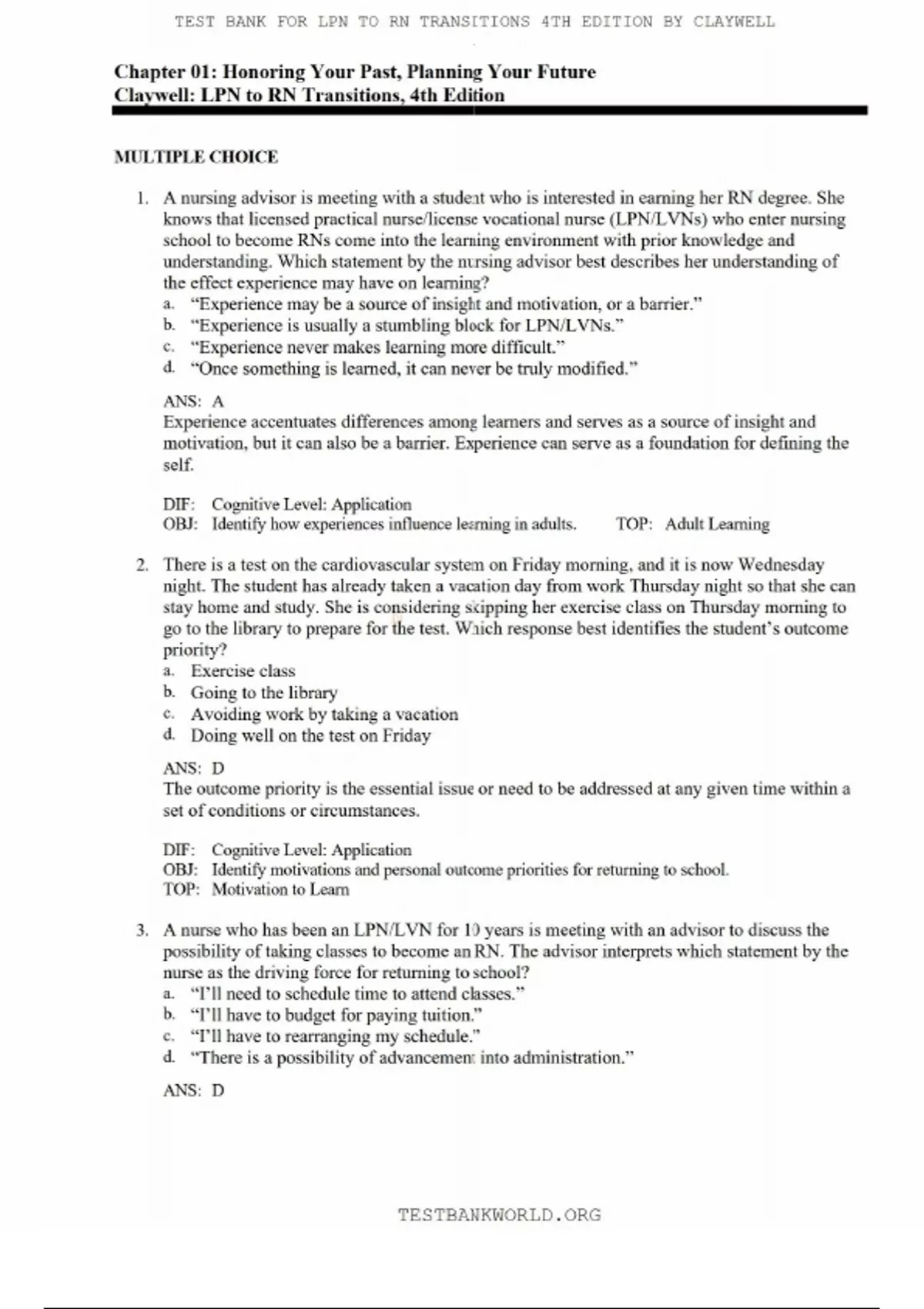 Complete All Chapters: Claywell: LPN to RN Transitions, 4th Edition Test Bank.