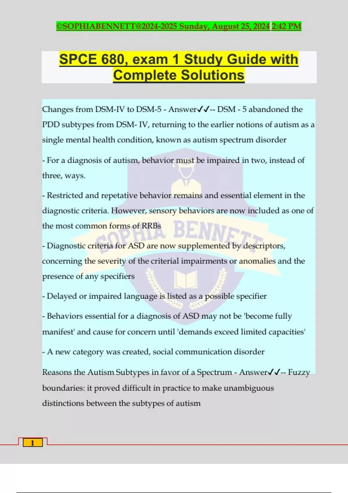 SPCE 680, exam 1 Study Guide with Complete Solutions Changes from DSM-IV to DSM-5 - Answer️️ -- DSM - 5 abandoned the PDD subtypes from DSM- IV, returning to the earlier notions of autism as a single mental health condition, known as autism spectrum disorder - For a diagnosis of autism, behavior must be impaired in two, instead of three, ways. - Restricted and repetative behavior remains and essential element in the diagnostic criteria. However, sensory behaviors are now included as one of the most common forms of RRBs - Diagnostic criteria for ASD are now supplemented by descriptors, concerning the severity of the criterial impairments or anomalies and the presence of any specifiers - Delayed or impaired language is listed as a possible specifier - Behaviors essential for a diagnosis of ASD may not be 'become fully manifest' and cause for concern until 'demands exceed limited capacities' - A new category was created, social communication disorder Reasons the Autism Subtypes in favor of a Spectrum - Answer️️ -- Fuzzy boundaries: it proved difficult in practice to make unambiguous distinctions between the subtypes of autism ©SOPHIABENNETT@ Sunday, August 25, 2024 2:42 PM 2 - Diagnostic instability: individuals change- they show improvement and they regress The term ___________________ increasingly commonly used from the 1990s onward. - Answer️️ -autism spectrum Why add descriptors? - Answer️️ -- facilitate the development of appropriate, individualized treatment plans - make diagnostic criteria broad enough to encompass the whole range of people with autism related behavior Why change the status of impaired language? - Answer️️ -Since impaired language is not invariably present in people with ASD, it was listed as a specifier rather then put it under the umbrella of socio-communicative impairment Why allow for late diagnosis? - Answer️️ -greater recognition of mild forms of ASD occurring in able individuals who compensate well and who 'get by' socially - at least until some life event brings their autism related problems under the spotlight. social communication disorder - Answer️️ -Persistent difficulties in the social use of verbal and nonverbal communication Groups who objected to the changes in the DSM 5 - Answer️️ -- people with an existing subtype diagnosis and their families ©SOPHIABENNETT@ Sunday, August 25, 2024 2:42 PM 3 - professionals involved in work relating to autism, including clinicians with responsibility for diagnosis, and also some researchers Wing's four types of autism related social behavior - Answer️️ -1. aloof: behave as if other people did not exist 2. passive: accept social approaches but do not initiate social interaction 3. active but odd: make social approaches to other people, but do so in a peculiar, one sided fashion 4. overly formal, stilted: try very hard to behave well and cope