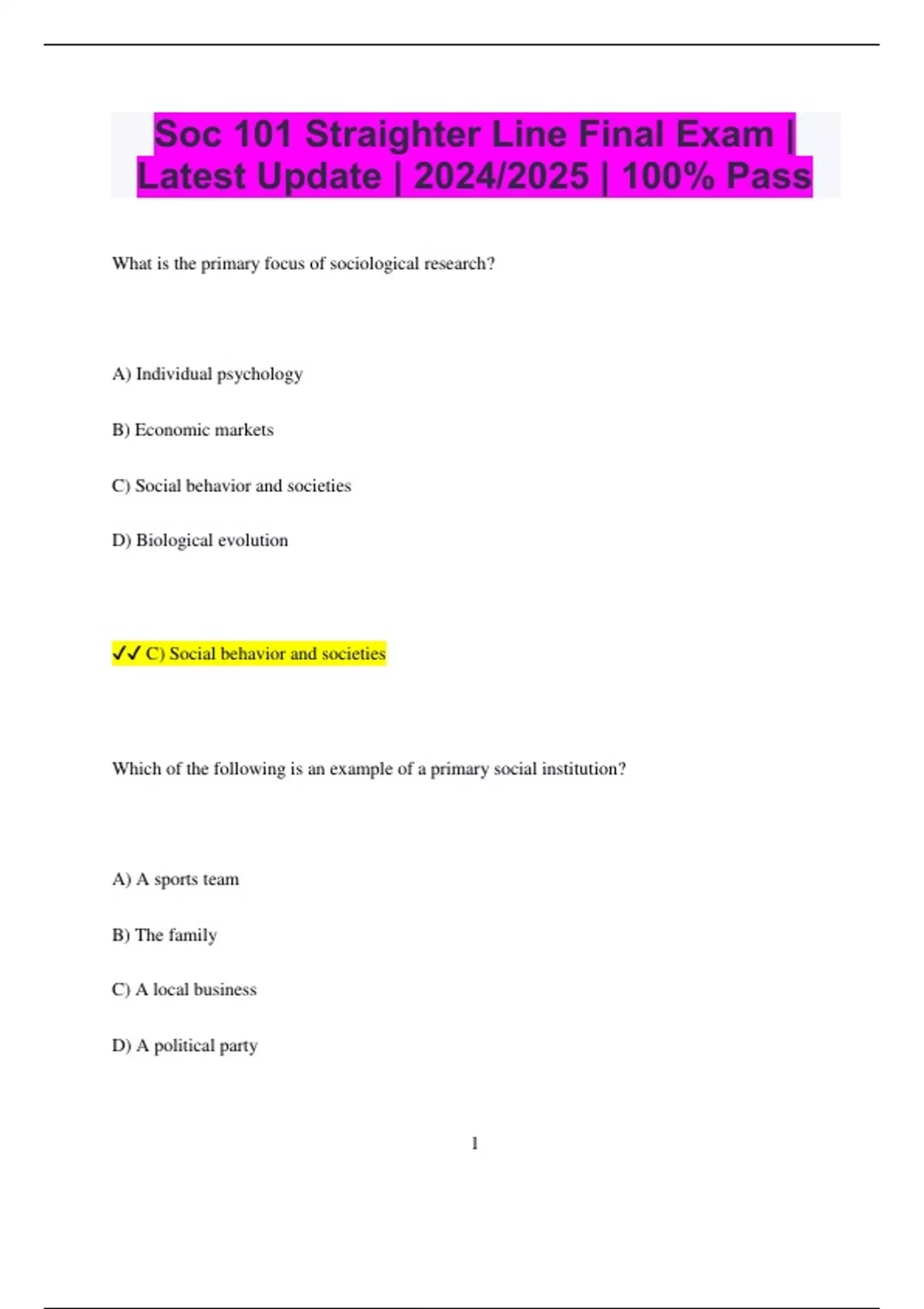 Soc 101 Straighter Line Final Exam | Latest Update | 2024/2025 | 100% Pass What is the primary focus of sociological research? A) Individual psychology B) Economic markets C) Social behavior and societies D) Biological evolution C) Social behavior and societies Which of the following is an example of a primary social institution? A) A sports team B) The family C) A local business D) A political party 2 B) The family What does the term "social stratification" refer to? A) The process of social learning B) The layering of individuals into hierarchical categories C) The creation of social networks D) The distribution of social media B) The layering of individuals into hierarchical categories How does functionalism view social institutions? A) As sources of conflict B) As mechanisms for social control C) As contributors to social stability D) As tools for individual success 3 C) As contributors to social stability Which concept refers to the ability to understand social phenomena from the perspective of those experiencing it? A) Empathy B) Cultural relativism C) Social solidarity D) Symbolic interaction