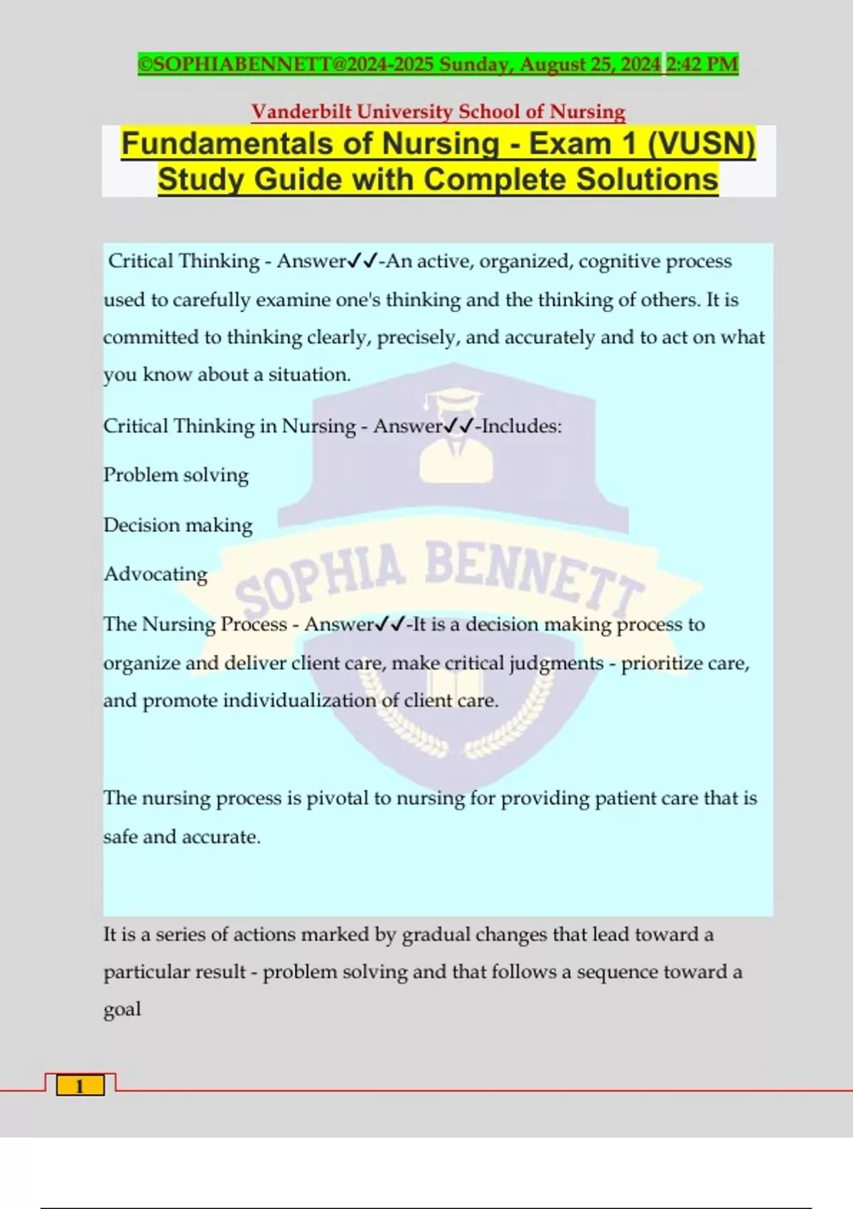 Fundamentals of Nursing - Exam 1 (VUSN) Study Guide with Complete Solutions Critical Thinking - Answer️️ -An active, organized, cognitive process used to carefully examine one's thinking and the thinking of others. It is committed to thinking clearly, precisely, and accurately and to act on what you know about a situation. Critical Thinking in Nursing - Answer️️ -Includes: Problem solving Decision making Advocating The Nursing Process - Answer️️ -It is a decision making process to organize and deliver client care, make critical judgments - prioritize care, and promote individualization of client care. The nursing process is pivotal to nursing for providing patient care that is safe and accurate. It is a series of actions marked by gradual changes that lead toward a particular result - problem solving and that follows a sequence toward a goal ©SOPHIABENNETT@ Sunday, August 25, 2024 2:42 PM Vanderbilt University School of Nursing 2 Contact Precautions - Answer️️ -Gown and Gloves Direct/Indirect Contact Visitors wash hands Airborne Precautions - Answer️️ -N-95 respirator and Negative Pressure room Transportation: patient wears surgical mask Visitors wear surgical mask Droplet Precaution - Answer️️ -Surgical Mask Transportation: patient wears surgical mask Signs of Infection - Answer️️ -Erythema, Exudate, pain, tenderness, changes in vital signs or system function Chain of Infection - Answer️️ -Infectious agent Reservoir Exit Portal ©SOPHIABENNETT@ Sunday, August 25, 2024 2:42 PM Vanderbilt University School of Nursing 3 Transmission Entry Portals Host Contact based transmission - Answer️️ -MRSA, C. difficile, RSV, Impetigo, Scabies, Lice Droplet based transmission - Answer️️ -Strep pharyngitis, pertussis, rubella, bacterial meningitis Airborne based transmission - Answer️️ -Measles and TB False low BP - Answer️️ -Cuff too wide Arm above heart level False high BP - Answer️️ -Cuff too narrow Arm below heart level Cuff/stethoscope placed over clothing Cuff too loose Repeated BP too soon 7 Dimensions of Pain - Answer️️ -Location Quality Quantity Timing/Onset ©SOPHIABENNETT@ Sunday, August 25, 2024 2:42 PM Vanderbilt University School of Nursing 4 Aggravating factors Alleviating factors Associated data Physiologic Indicator of Pain (FLACC) - Answer️️ -Facial expression Leg movement Activity Crying Consolability Physical Assessment Techniques (Order specific) - Answer️️ -IPPA: Inspect, Palpate, Percuss, Auscultate Plexor - Answer️️ -Related to Percussion: Opposite
