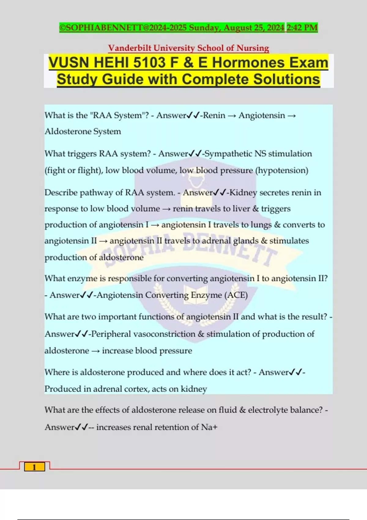 VUSN HEHI 5103 F & E Hormones Exam Study Guide with Complete Solutions What is the "RAA System"? - Answer️️ -Renin → Angiotensin → Aldosterone System What triggers RAA system? - Answer️️ -Sympathetic NS stimulation (fight or flight), low blood volume, low blood pressure (hypotension) Describe pathway of RAA system. - Answer️️ -Kidney secretes renin in response to low blood volume → renin travels to liver & triggers production of angiotensin I → angiotensin I travels to lungs & converts to angiotensin II → angiotensin II travels to adrenal glands & stimulates production of aldosterone What enzyme is responsible for converting angiotensin I to angiotensin II? - Answer️️ -Angiotensin Converting Enzyme (ACE) What are two important functions of angiotensin II and what is the result? - Answer️️ -Peripheral vasoconstriction & stimulation of production of aldosterone → increase blood pressure Where is aldosterone produced and where does it act? - Answer️️ - Produced in adrenal cortex, acts on kidney What are the effects of aldosterone release on fluid & electrolyte balance? - Answer️️ -- increases renal retention of Na+ ©SOPHIABENNETT@ Sunday, August 25, 2024 2:42 PM Vanderbilt University School of Nursing 2 - increases renal excretion of K+ - increases water retention - increases blood pressure Where is cortisol produced and where does it act? - Answer️️ -Produced in adrenal cortex, acts on kidney What are the effects of cortisol release on fluid & electrolyte balance? - Answer️️ -- increases renal retention of Na+ - increases blood pressure How is the action of cortisol different than that of aldosterone? - Answer️️ -Action of cortisol (a glucocorticoid) much less intense than action of aldosterone (a mineralocorticoid) Where is Atrial Natriuretic Peptide (ANP) produced? - Answer️️ - Produced in right atrium of heart What triggers release of ANP? - Answer️️ -Elevation in (atrial) blood pressure What are the effects of ANP release on fluid & electrolyte balance? - Answer️️ -ANP released in response to elevation in BP → inhibits Na+ reabsorption and aldosterone secretion → increases renal secretion of Na+ and H2O ©SOPHIABENNETT@ Sunday, August 25, 2024 2:42 PM Vanderbilt University School of Nursing 3 What are the effects of ANP release on blood vessels & BP? - Answer️️ - Dilation (vasodilation) → decreased blood volume → decreased BP Where is ADH (vasopressin) produced & stored, and where does it act? - Answer️️ -Produced in hypothalamus, stored in posterior pituitary, acts on kidney What triggers the release of ADH? - Answer️️ -Decreased blood volume/pressure and/or increased serum concentration (due to loss of water) What are the effects of ADH release on fluid & electrolyte balance & urine output? - Answer️️ -"water-conserving hormone" Renal retention of H2O → increased blood volume & dilution of serum concentration of Na+ → more concentrated urine What is the impact of ADH release on blood vessels & BP? - Answer️️ - Constriction (vasoconstriction) →increased blood volume → increa