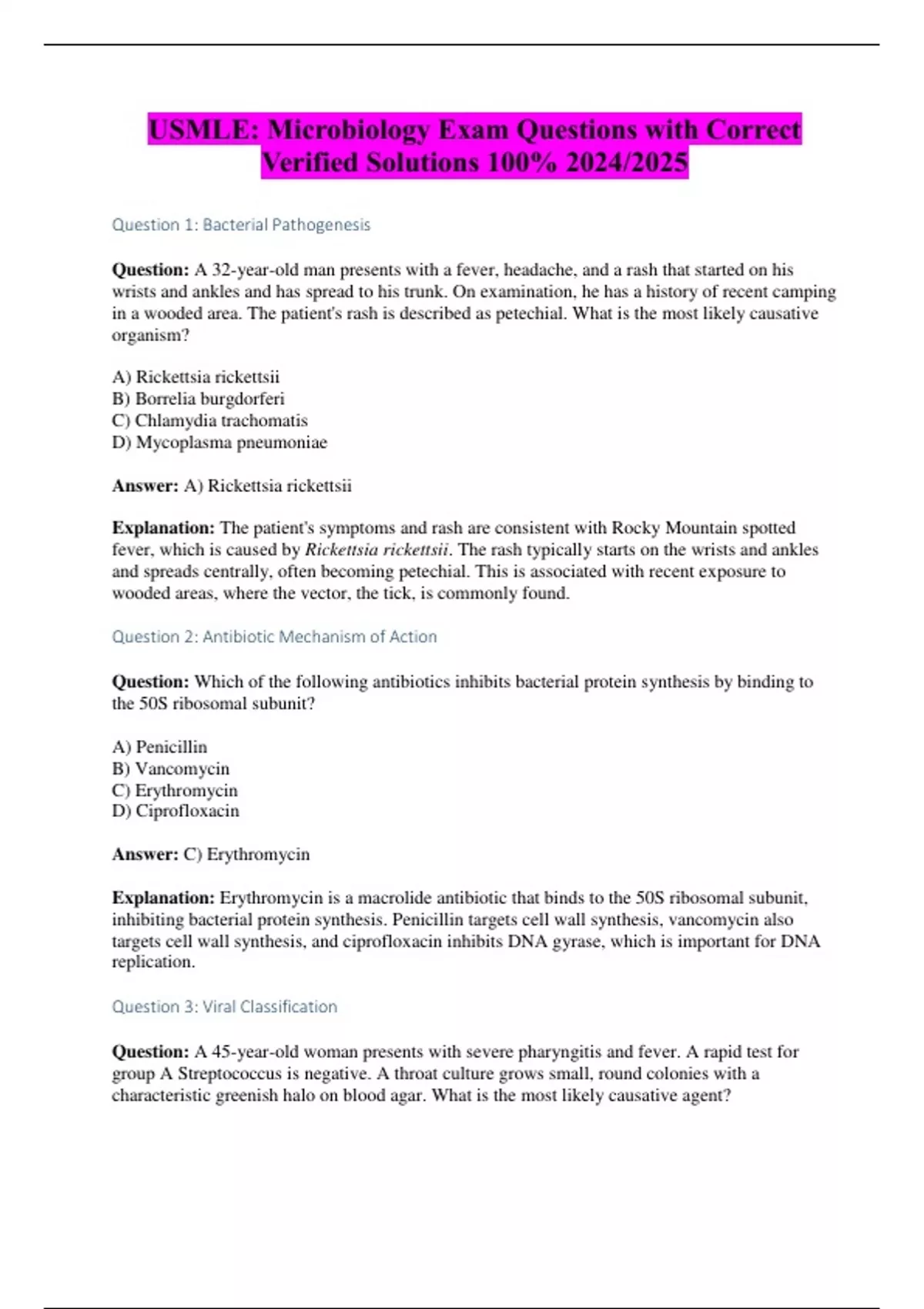 Explanation: Erythromycin is a macrolide antibiotic that binds to the 50S ribosomal subunit,