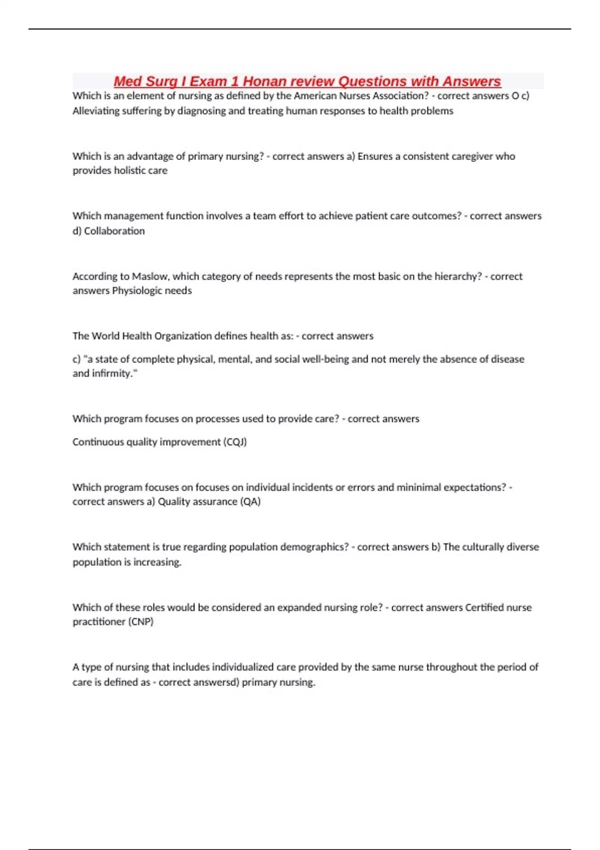 Med Surg I Exam 1 Honan review Questions with Answers Which is an element of nursing as defined by the American Nurses Association? - correct answers O c) Alleviating suffering by diagnosing and treating human responses to health problems Which is an advantage of primary nursing? - correct answers a) Ensures a consistent caregiver who provides holistic care Which management function involves a team effort to achieve patient care outcomes? - correct answers d) Collaboration According to Maslow, which category of needs represents the most basic on the hierarchy? - correct answers Physiologic needs The World Health Organization defines health as: - correct answers c) "a state of complete physical, mental, and social well-being and not merely the absence of disease and infirmity." Which program focuses on processes used to provide care? - correct answers Continuous quality improvement (CQJ) Which program focuses on focuses on individual incidents or errors and mininimal expectations? - correct answers a) Quality assurance (QA) Which statement is true regarding population demographics? - correct answers b) The culturally diverse population is increasing. Which of these roles would be considered an expanded nursing role? - correct answers Certified nurse practitioner (CNP) A type of nursing that includes individualized care provided by the same nurse throughout the period of care is defined as - correct answersd) primary nursing. Which is a primary task of nursing research? - correct answersContributing to the scientific base of nursing practice Which is an important role for a nurse in the health care delivery system? - correct answersIdentifying patient needs and working with patients to address them A nursing student overhears a patient talking with a rehabilitation nurse. the patient states I plan to recover from my stroke to my best ability I know I will always have some limitations; however I will not let the limitations slow me down. which descriptor of health does the patient exemplify with this statement? - correct answersThe concept of a health-illness continuum. Which of these statements best defines the term culture? - correct answersc) The learned patterns of behavior, beliefs, and values that can be attributed to a particular group of people According to Maslow's hierarchy of human needs, which of the following is the highest level of need(s)? - correct answersc) Self-actualization A nurse with 20 years experience attends a hospital-required training session and learns a new bibliography of peer-reviewed articles related to NG tube placement. The nurse recognizes the change in procedure developed from which method? method for assessing nasogastric (NG) tube placement. - correct answersc) Evidence-based practice The nurse educator is planning a team session for nursing students related to the treatment and management of just stational diabetes. The nurse educator arranges for a dietitian, pharmacist, and a physician assistant to participate in the lesson plan. Which professional nurse competency is the nurse educator demonstrating? - correct answersInterdisciplinary teamwork An advanced practice registered nurse (APRN) specializing in adult-gerontology has accepted a new position in a different state. Which governing body does the APRN need to consuit to verify prescriptive authority the new state? - correct answersb) The new state's boards of nursing A client has been admitted in the emergency care unit with conditions of respiratory distress and pneumonia. The client's condition worsens and requires mechanical ventilation. While visiting this client in the care hospital, the family observes members of the health care team washing their hands upon