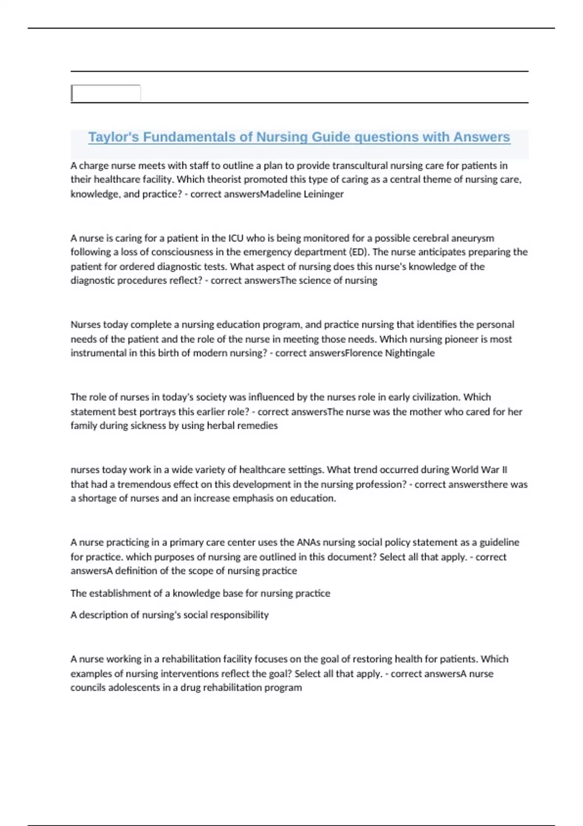 Taylor's Fundamentals of Nursing Guide questions with Answers A charge nurse meets with staff to outline a plan to provide transcultural nursing care for patients in their healthcare facility. Which theorist promoted this type of caring as a central theme of nursing care, knowledge, and practice? - correct answersMadeline Leininger A nurse is caring for a patient in the ICU who is being monitored for a possible cerebral aneurysm following a loss of consciousness in the emergency department (ED). The nurse anticipates preparing the patient for ordered diagnostic tests. What aspect of nursing does this nurse's knowledge of the diagnostic procedures reflect? - correct answersThe science of nursing Nurses today complete a nursing education program, and practice nursing that identifies the personal needs of the patient and the role of the nurse in meeting those needs. Which nursing pioneer is most instrumental in this birth of modern nursing? - correct answersFlorence Nightingale The role of nurses in today's society was influenced by the nurses role in early civilization. Which statement best portrays this earlier role? - correct answersThe nurse was the mother who cared for her family during sickness by using herbal remedies nurses today work in a wide variety of healthcare settings. What trend occurred during World War II that had a tremendous effect on this development in the nursing profession? - correct answersthere was a shortage of nurses and an increase emphasis on education. A nurse practicing in a primary care center uses the ANAs nursing social policy statement as a guideline for practice. which purposes of nursing are outlined in this document? Select all that apply. - correct answersA definition of the scope of nursing practice The establishment of a knowledge base for nursing practice A description of nursing's social responsibility A nurse working in a rehabilitation facility focuses on the goal of restoring health for patients. Which examples of nursing interventions reflect the goal? Select all that apply. - correct answersA nurse councils adolescents in a drug rehabilitation program A charge nurse meets with staff to outline a plan to provide transcultural nursing care for patients in their healthcare facility. Which theorist promoted this type of caring as a central theme of nursing care, knowledge, and practice? - correct answersMadeline Leininger A nurse is caring for a patient in the ICU who is being monitored for a possible cerebral aneurysm following a loss of consciousness in the emergency department (ED). The nurse anticipates preparing the patient for ordered diagnostic tests. What aspect of nursing does this nurse's knowledge of the diagnostic procedures reflect? - correct answersThe science of nursing Nurses today complete a nursing education program, and practice nursing that identifies the personal needs of the patient and the role of the nurse in meeting those needs. Which nursing pioneer is most instrumental in this birth of modern nursing? - correct answersFlorence Nightingale The role of nurses in today's society was influenced by the nurses role in early civilization. Which statement best portrays this earlier role? - correct answersThe nurse was the mother who cared for her family during sickness by using herbal remedies nurses today work in a wide variety of healthcare settings. What trend occurred during World War II that had a tremendous effect on this development in the nursing profession? - correct answersthere was a shortage of nurses and an increase emphasis on education. A nurse practicing in a primary care center uses the ANAs nursing social policy statement as a guideline for practice. which purposes of nursing are outlined in this document? Select all that apply. - correct answersA definition of the scope of nursing practice The establishment of a knowledge base for nursing practice A description of nursing's social responsibility A nurse working in a rehabilitation facility focuses on the goal of restoring health for patients. Which examples of nursing interventions reflect the goal? Select all that apply. - correct answersA nurse councils adolescents in a drug rehabilitation program