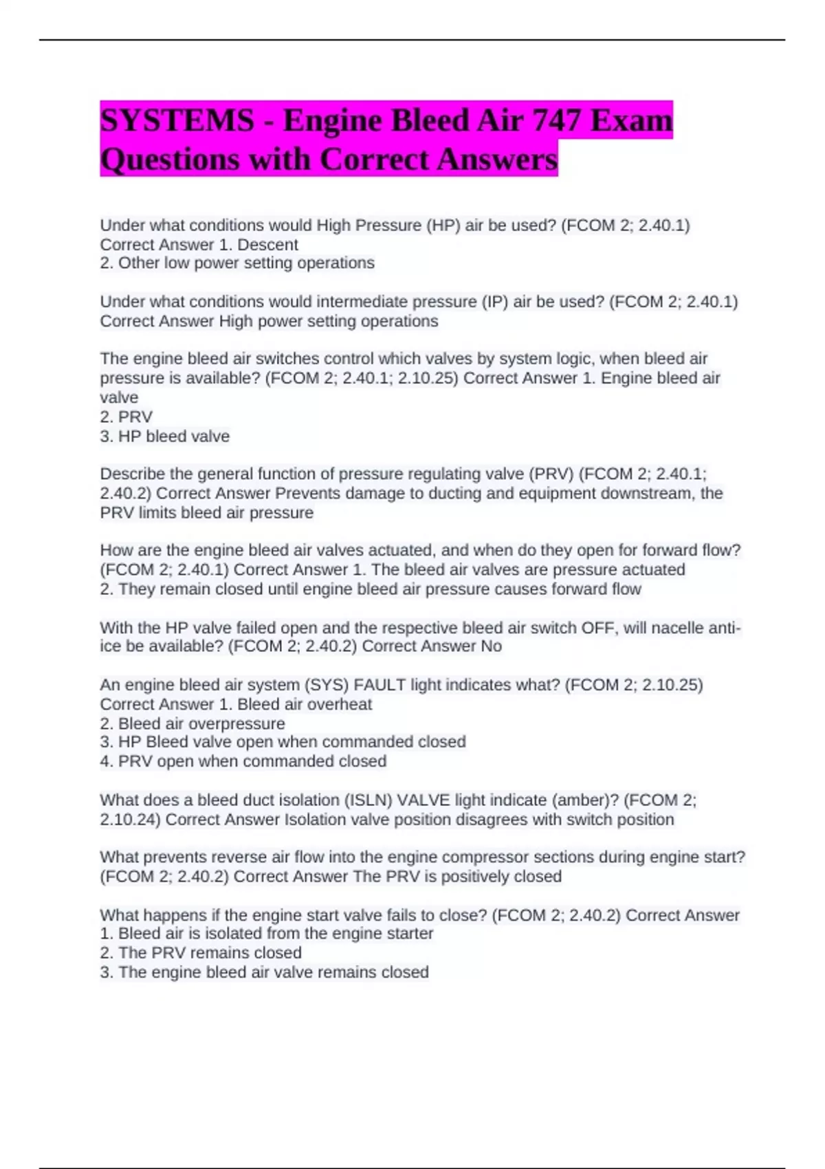 SYSTEMS - Engine Bleed Air 747 Exam Questions with Correct Answers