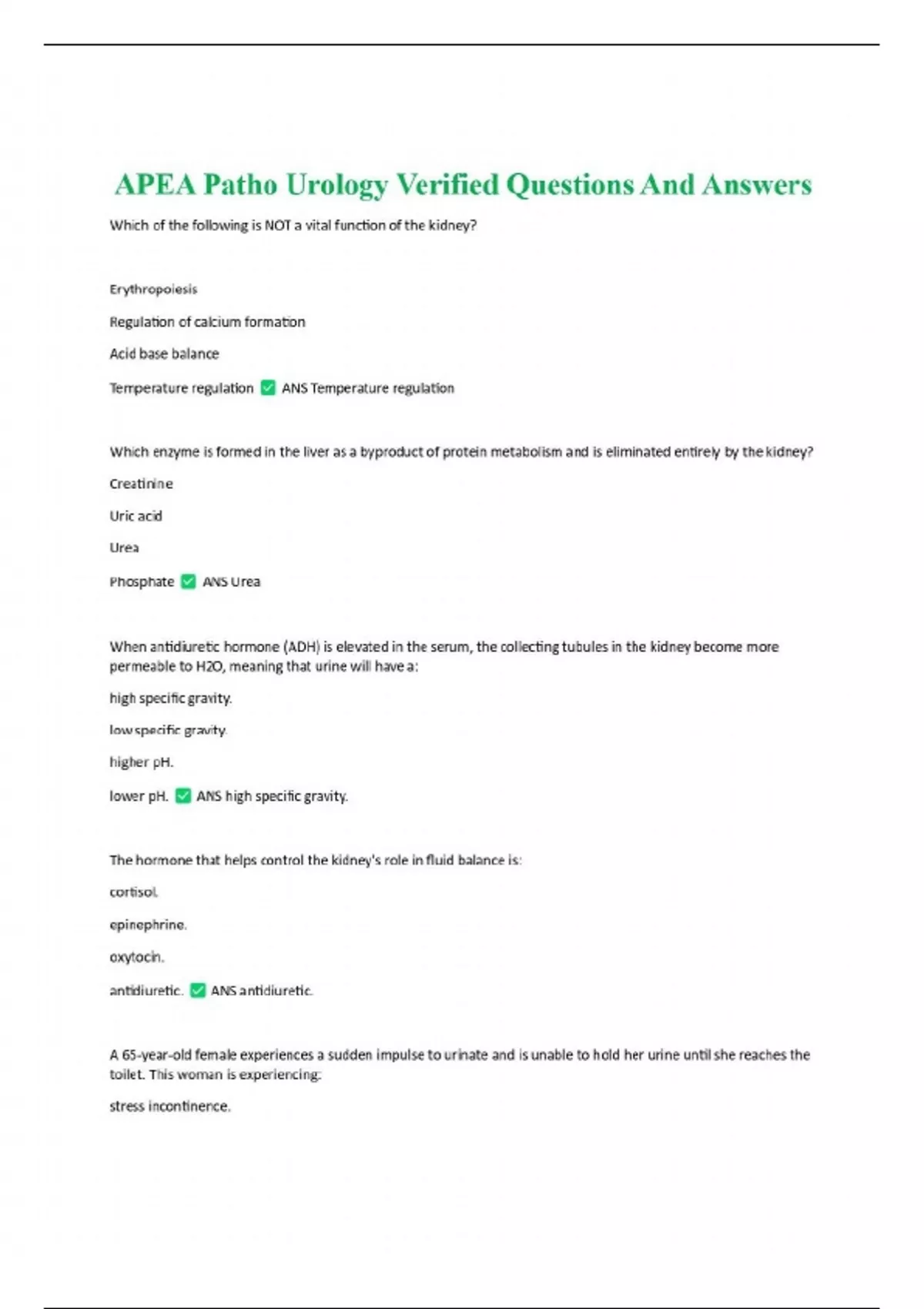 APEA Patho Urology Verified Questions And Answers Which of the following is NOT a vital function of the kidney? Erythropoiesis Regulation of calcium formation Acid base balance Temperature regulation ANS Temperature regulation Which enzyme is formed in the liver as a byproduct of protein metabolism and is eliminated entirely by the kidney? Creatinine Uric acid Urea Phosphate ANS Urea When antidiuretic hormone (ADH) is elevated in the serum, the collecting tubules in the kidney become more permeable to H2O, meaning that urine will have a: high specific gravity. low specific gravity. higher pH. lower pH. ANS high specific gravity. The hormone that helps control the kidney's role in fluid balance is: cortisol. epinephrine. oxytocin. antidiuretic. ANS antidiuretic.