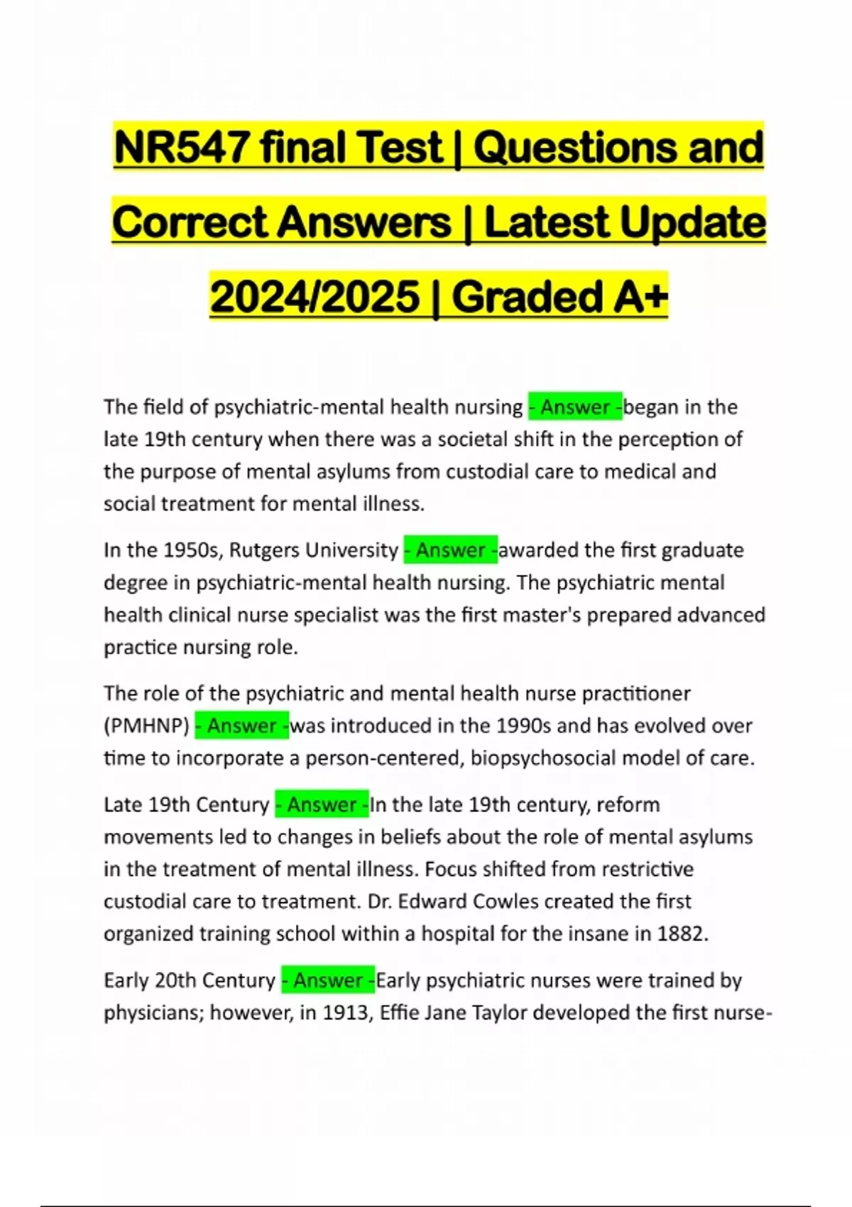 NR547 final Test | Questions and Correct Answers | Latest Update 2024/2025 | Graded A+ The field of psychiatric-mental health nursing - Answer -began in the late 19th century when there was a societal shift in the perception of the purpose of mental asylums from custodial care to medical and social treatment for mental illness. In the 1950s, Rutgers University - Answer -awarded the first graduate degree in psychiatric-mental health nursing. The psychiatric mental health clinical nurse specialist was the first master's prepared advanced practice nursing role. The role of the psychiatric and mental health nurse practitioner (PMHNP) - Answer -was introduced in the 1990s and has evolved over time to incorporate a person-centered, biopsychosocial model of care. Late 19th Century - Answer -In the late 19th century, reform movements led to changes in beliefs about the role of mental asylums in the treatment of mental illness. Focus shifted from