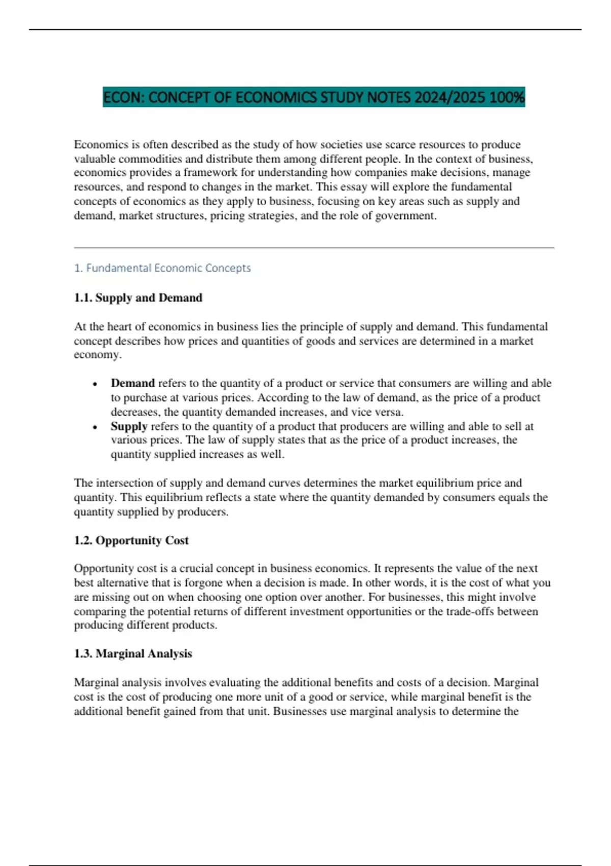 concepts of economics as they apply to business, focusing on key areas such as supply and